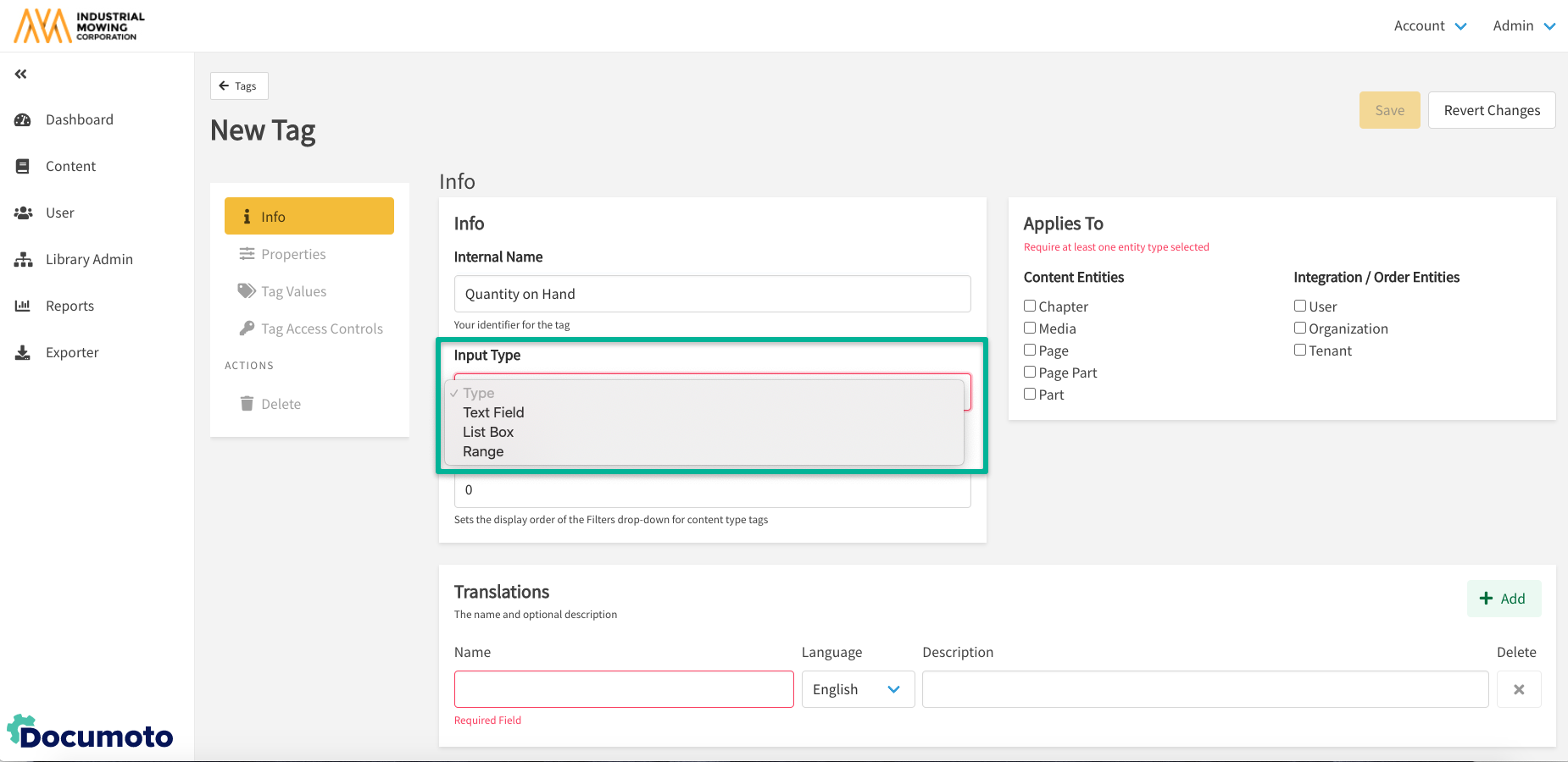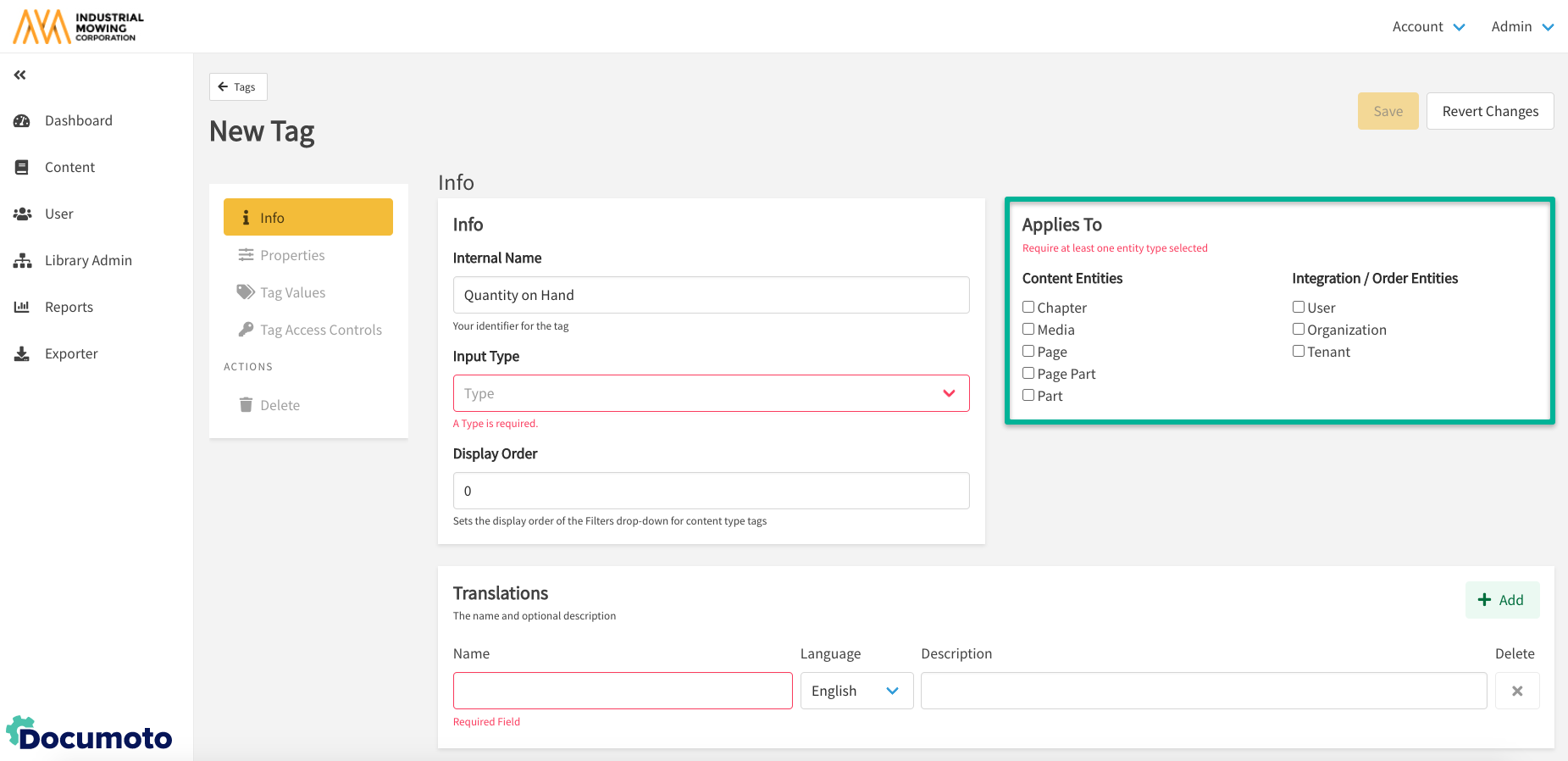 Now that you have a better idea of the types of Tags Documoto supports, the next step is to analyze your content and identify common or key attributes and information that should be captured utilizing tags. You can then determine where the information should appear in Documoto.