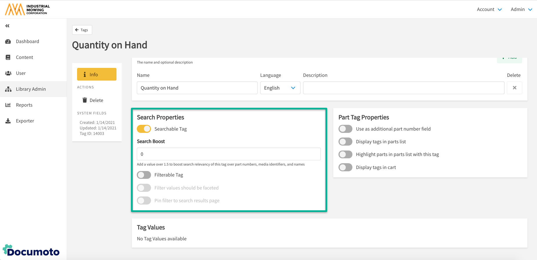 The Search Boost property allows administrators to boost the search relevancy of the tag. In Documoto, select system fields such as: part number, part name, page filename, page name, media identifier and media name have a 1.5 search boost to ensure these entities are the most relevant when searching within the Library. To ensure a tag is as important or more important than the system fields, add a search boost of 1.5 or higher.