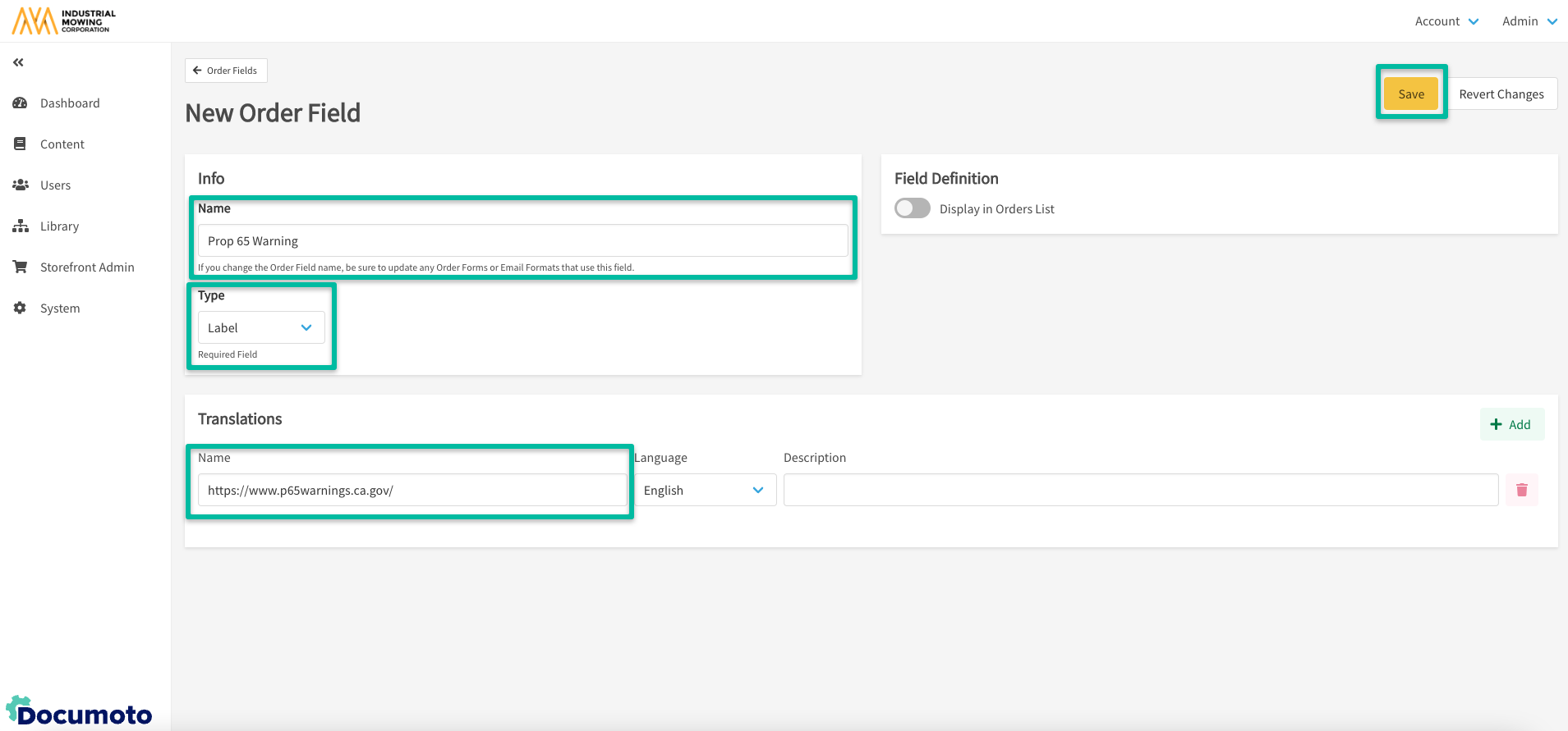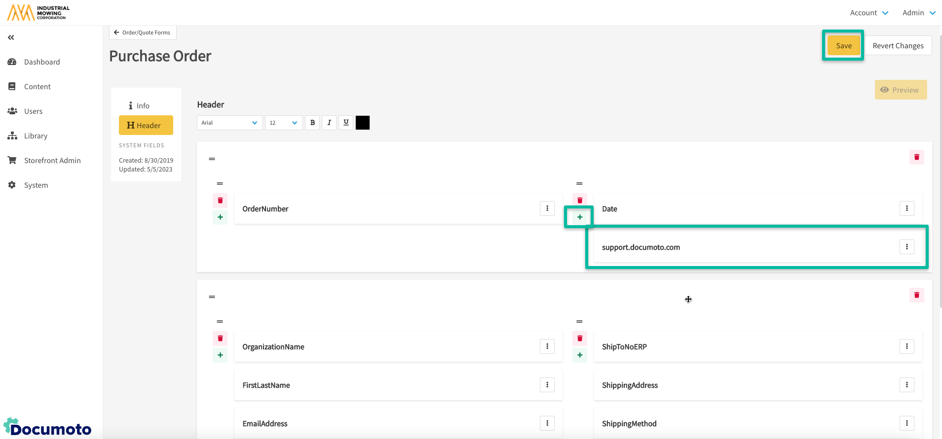 - Within Documoto Admin Center, go to Storefront Admin > Order Fields.
