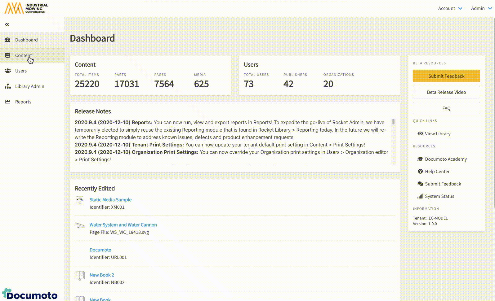 - Within Documoto Admin go to Content and select the desired media type (Parts, Pages, Media, or Templates).