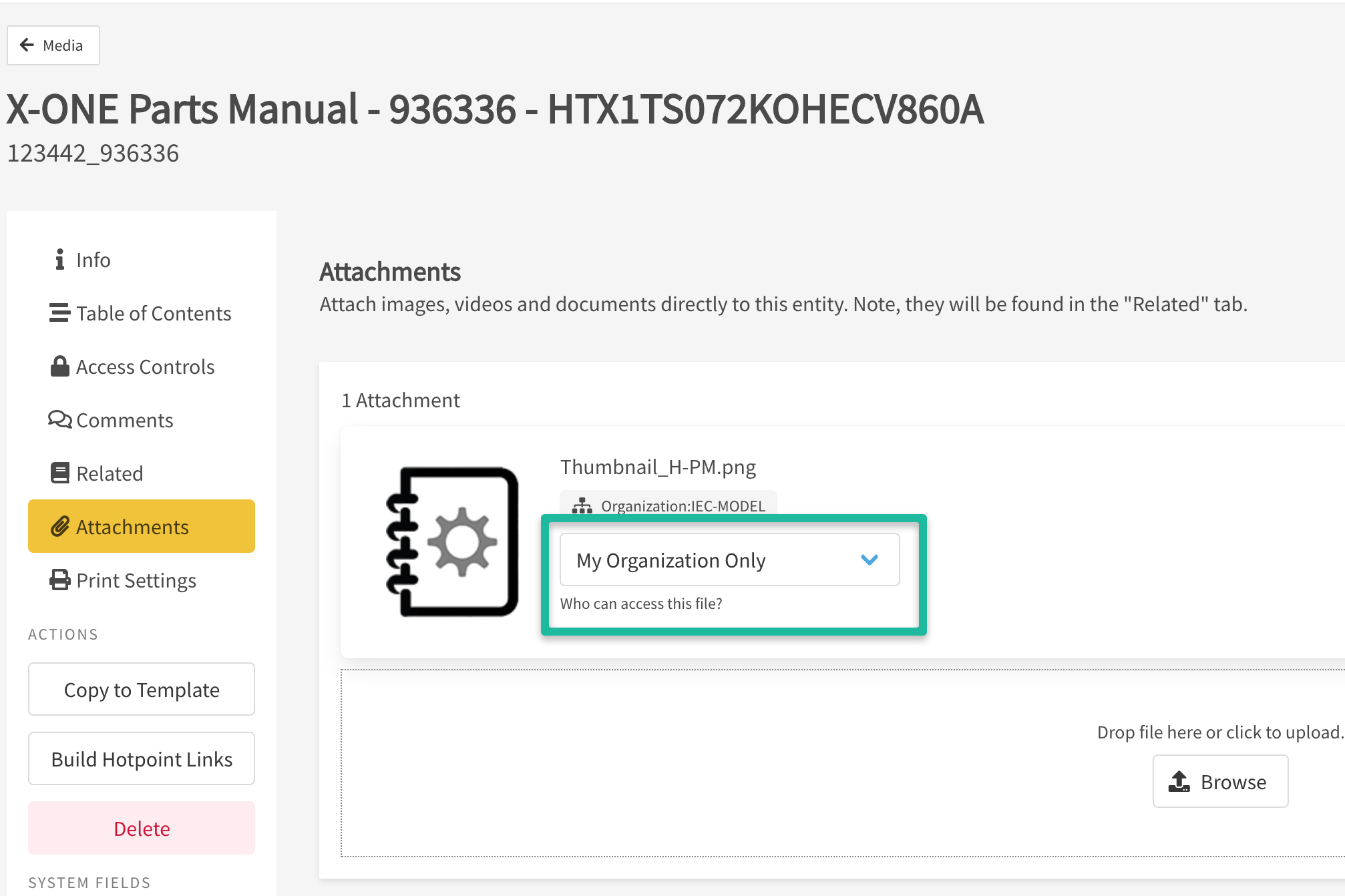 This article describes how to add and manage Attachments to part, page, media, chapter, and template content in Documoto Admin. In the Documoto library, Attachments can be found under the Related anchor in Item Details Pages.