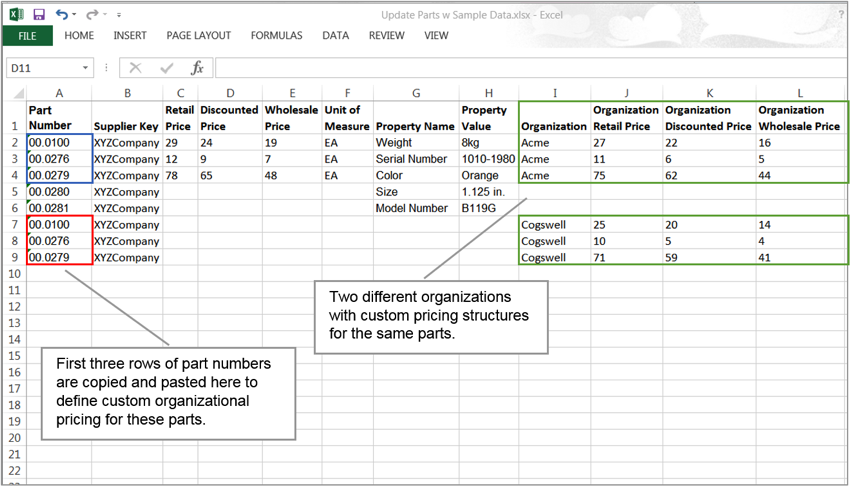 - Note: In the example screen shot, the ‘Acme’ and ‘Cogswell’ organizations have been set up with two different sets of pricing for the same part numbers. As with the‘Property Name / Property Value’ attributes, you can copy and paste part numbers and enter desired values in the row(s) below your other data if you have more than one set of prices for the same part number.