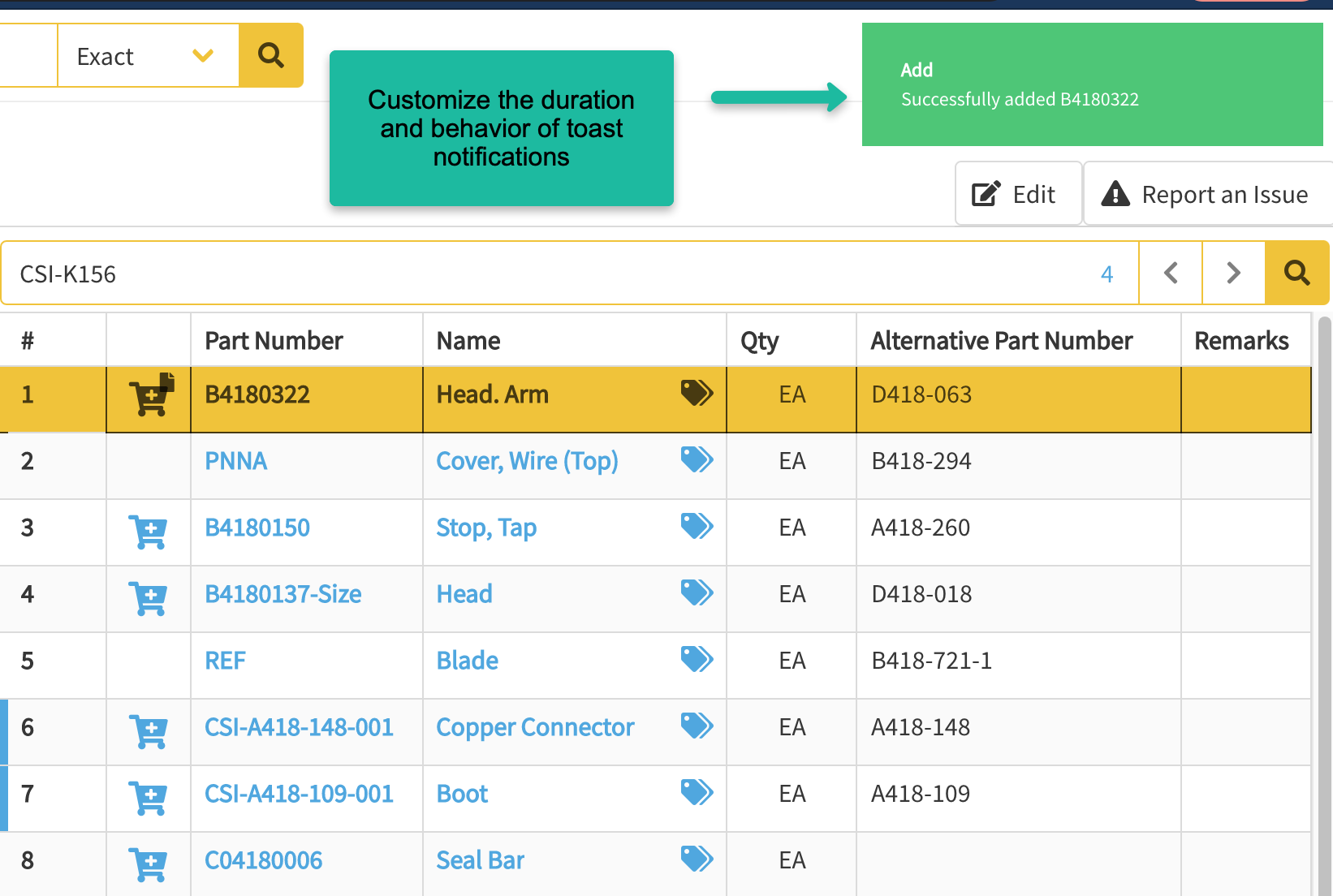 Customers looking to customize the behavior and duration of their Toast Notifications when users add a part to their cart, can now do so within their tenant Library Settings.