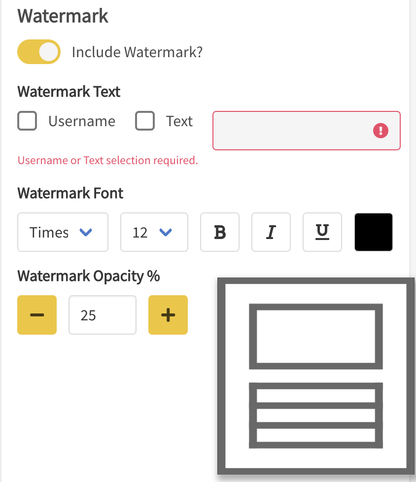 - To configure how the watermark displays, select the checkbox next to Username or Text.
