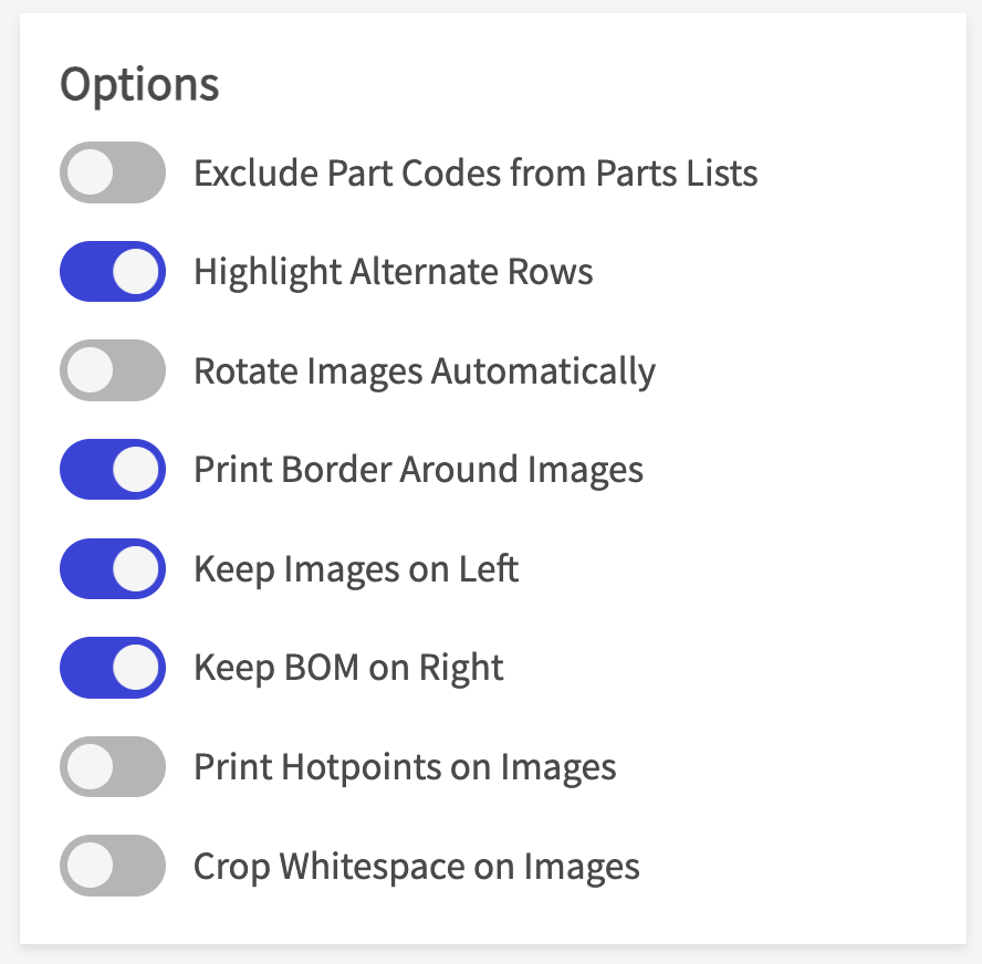 For this section, you will need to enable the settings you would like to invoke when a user exports a PDF parts manual. For a detailed list of what these options are, refer to the below: