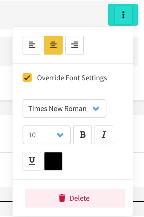 Override Font Settings: Allows you to override the particular font settings (alignment, font, font size, format, and color for a field. You an also delete the field from this menu.