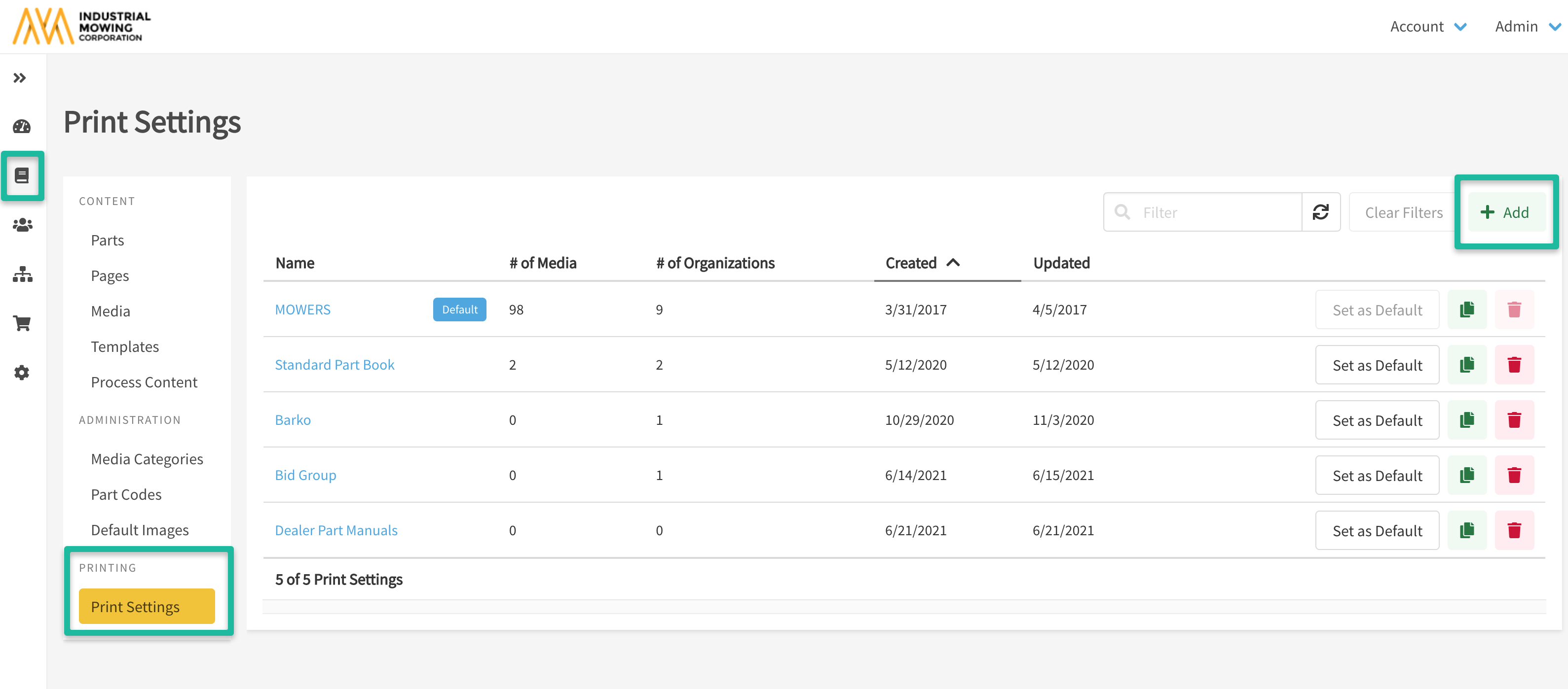 - Similar to Book Templates, users can copy an existing Print Setting and modify it to something new. Refer to the green copy icon in the screenshot below to do so