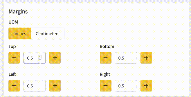 - Set the Margin values for both the top/bottom and left/right side of the page by using the -, +, arrows, or entering a value in the field.
