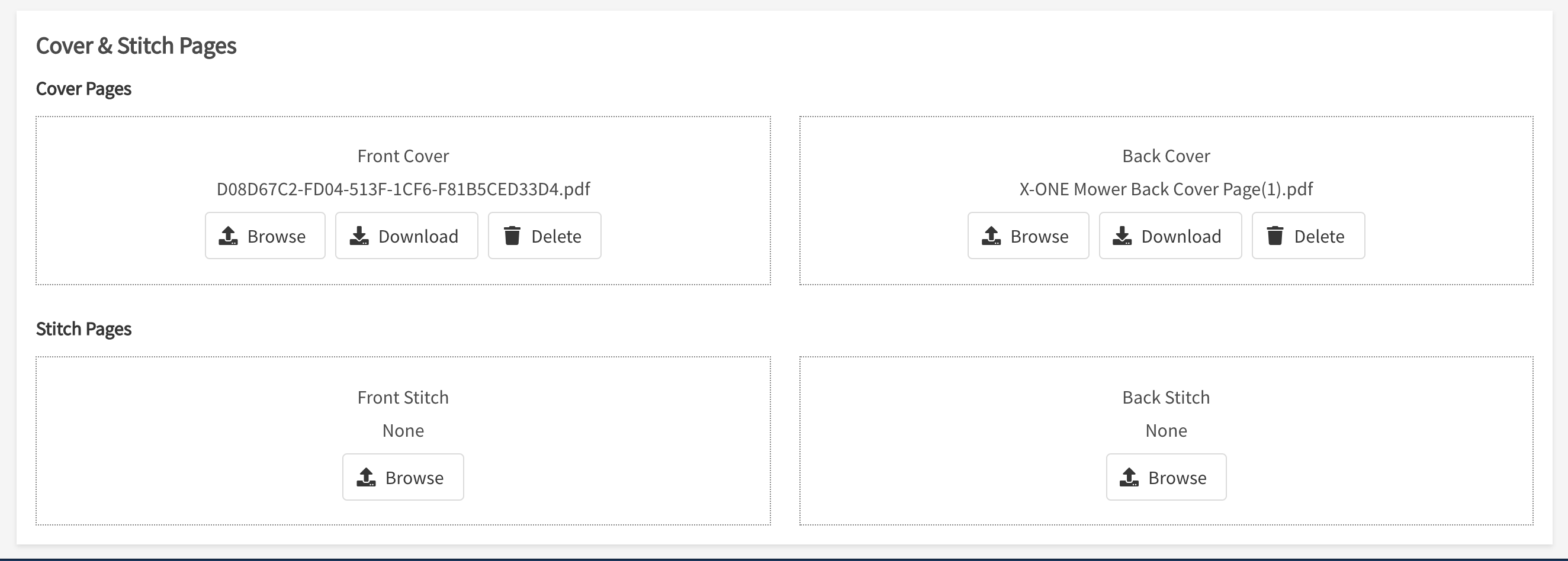- For either a Cover or Stitch page, click Browse to upload the PDF of your choice.