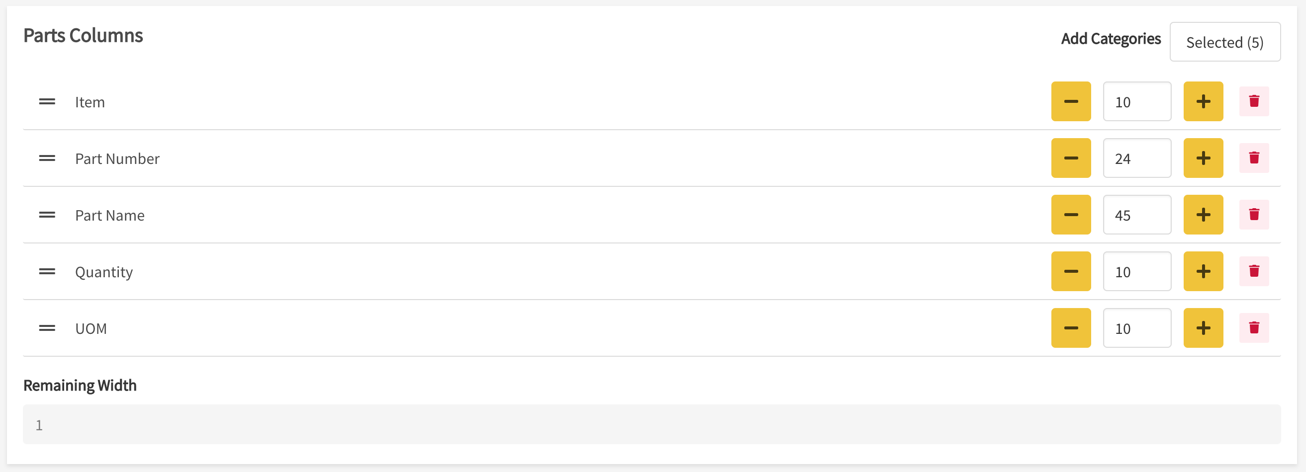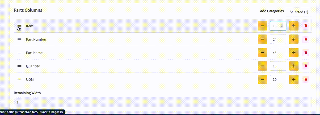 - Delete: Select the red Delete icon to remove a parts column.