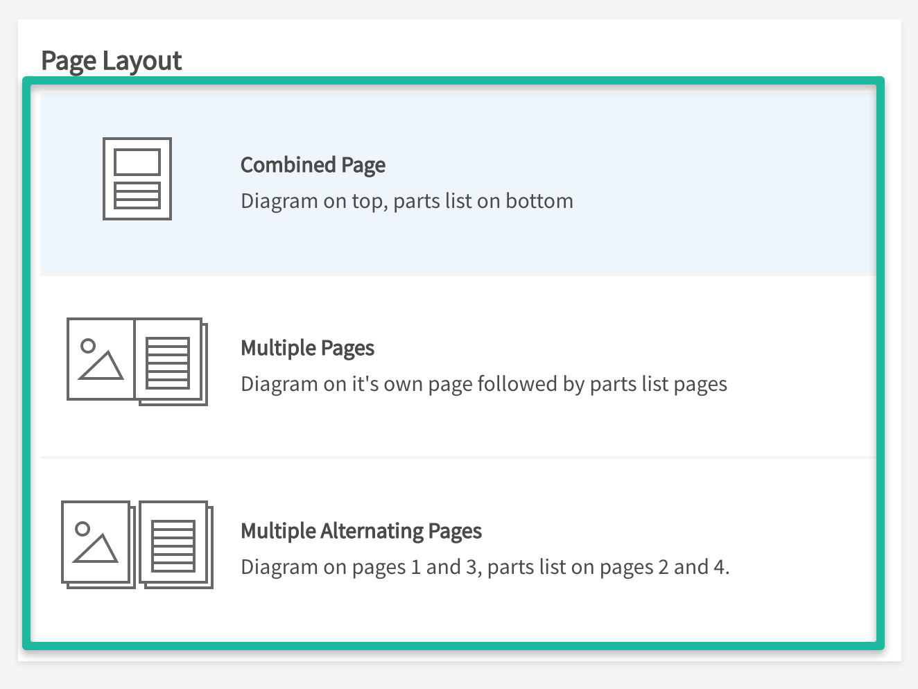 - Under the Page Layout section, select 1 of 3 tiles for how you want the parts manual to print.