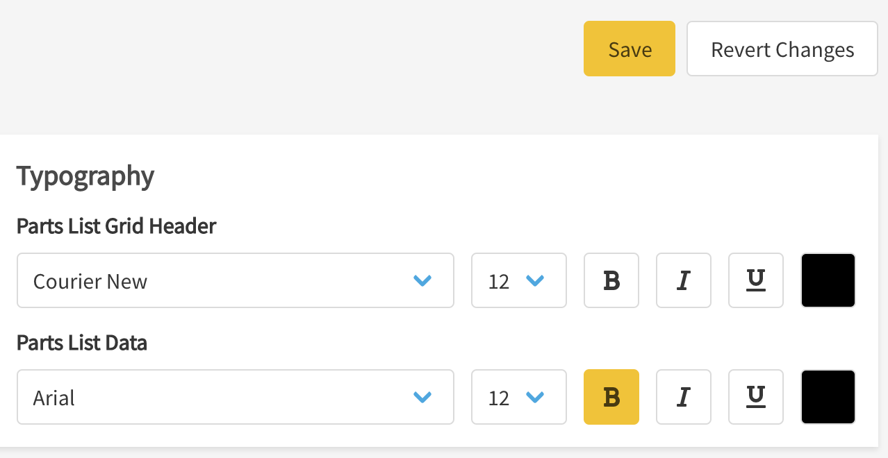 - Set the Typography for both your Parts List Grid Header and Parts List Data, if necessary.