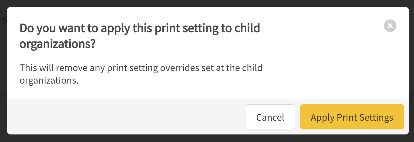 You will also see an option called Apply to Child Organizations. If selected, this option gives you the ability to also set the new Print Setting to any child organizations below the organization you have selected.