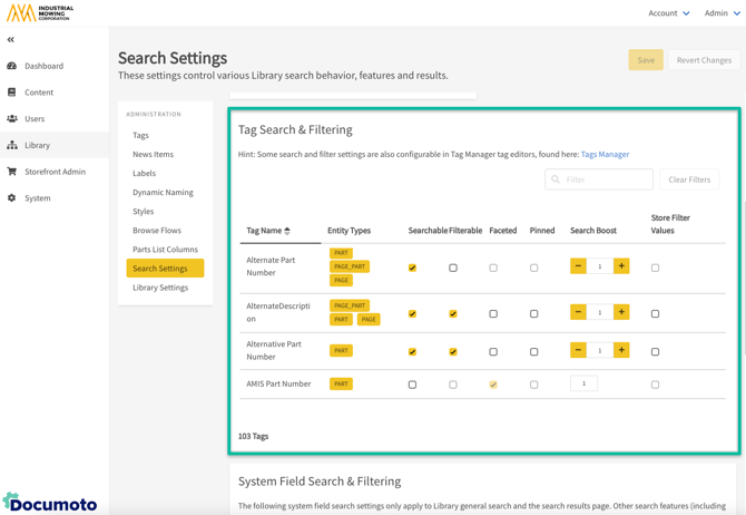 Search Settings define how search behavior, features, and results function across your entire Documoto tenant. These configurations control the search and filtering experience within the Documoto Library.