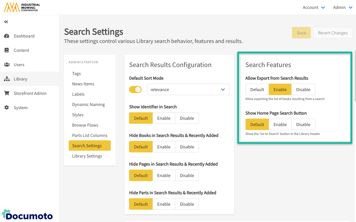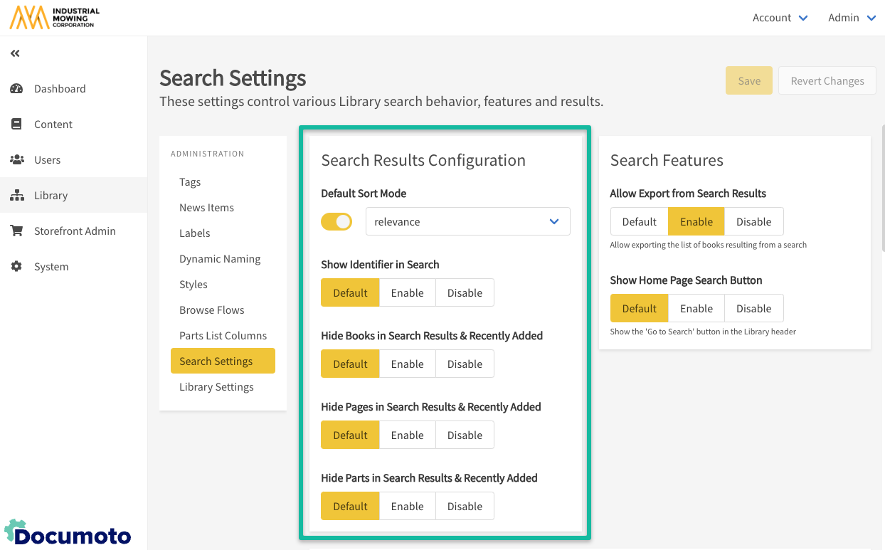 - Within Documoto go to Admin > Admin Center > Library > Search Settings