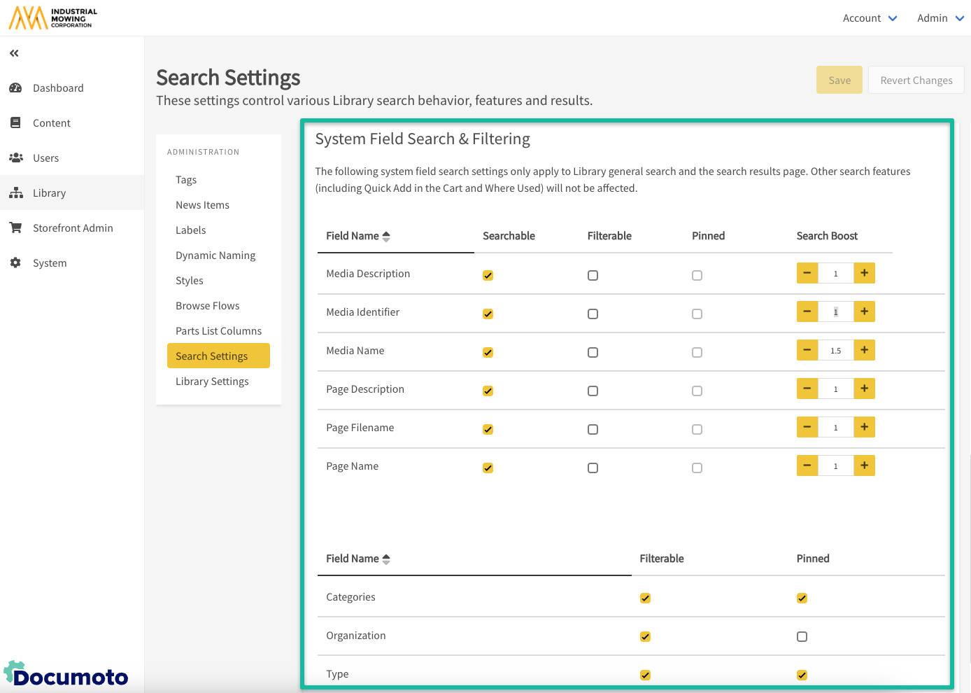 The System Field Search & Filtering settings grid allows Administrators to configure which System Fields should or should not be Searchable, Filterable, and Pinned in the Documoto Library. Admins may also configure the Search Boost to boost the relevancy of search results for any of the System Fields. These System Fields include: