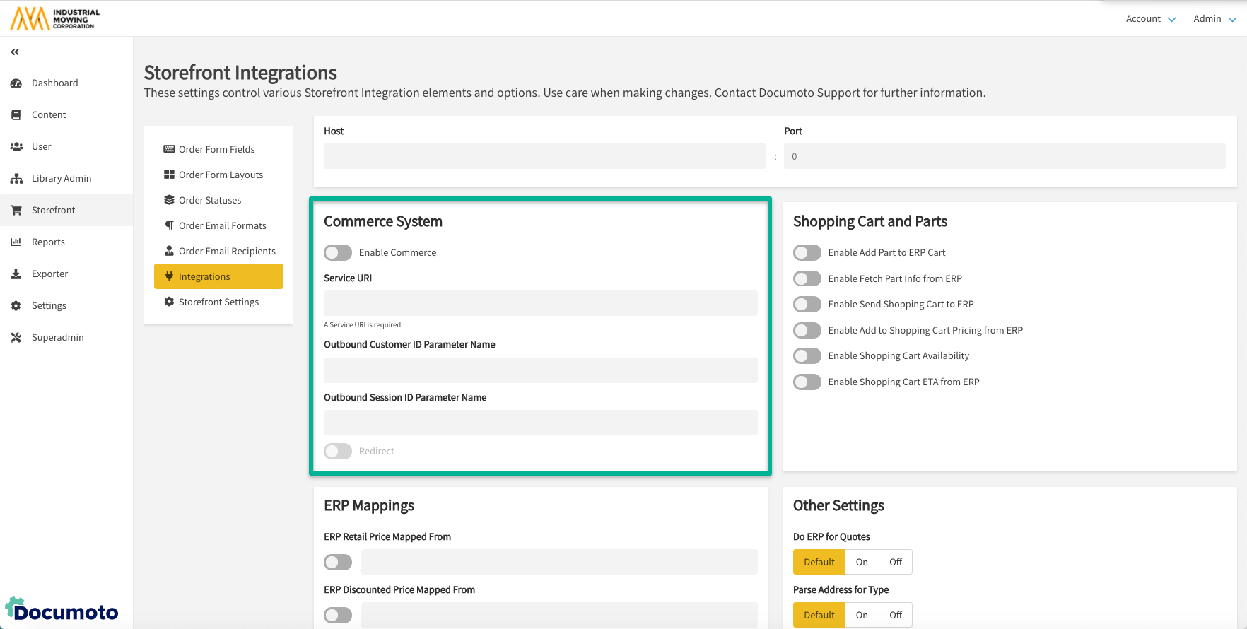 Commerce System settings control redirect behavior from Documoto to an external system when submitting the cart. Any changes to Commerce System settings could potentially break your Documoto integration. As a result, we highly recommend reaching out to your Documoto Customer Success Manager or Solutions Engineer prior to making any changes to these settings.