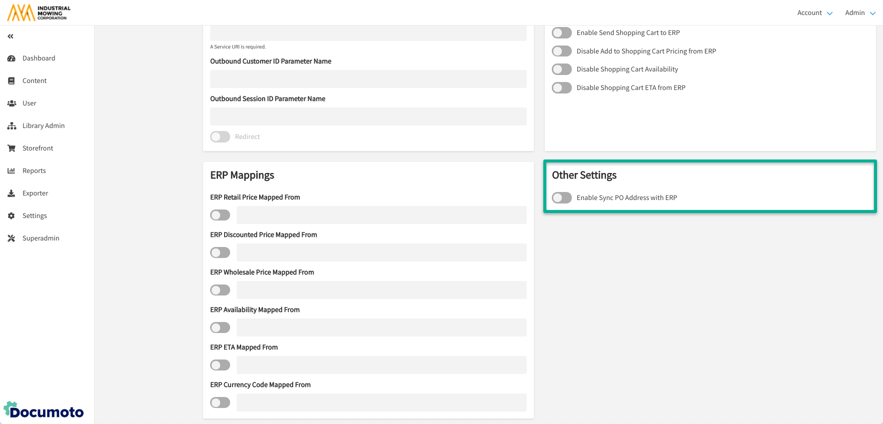 Other Settings allow you to enable additional available integration services to your ERP, eCommerce, and EAM systems for your tenant. Once again, any changes to Other Settings settings could potentially break your Documoto integration. As a result, we highly recommend reaching out to your Documoto Customer Success Manager or Solutions Engineer prior to making any changes to these settings.