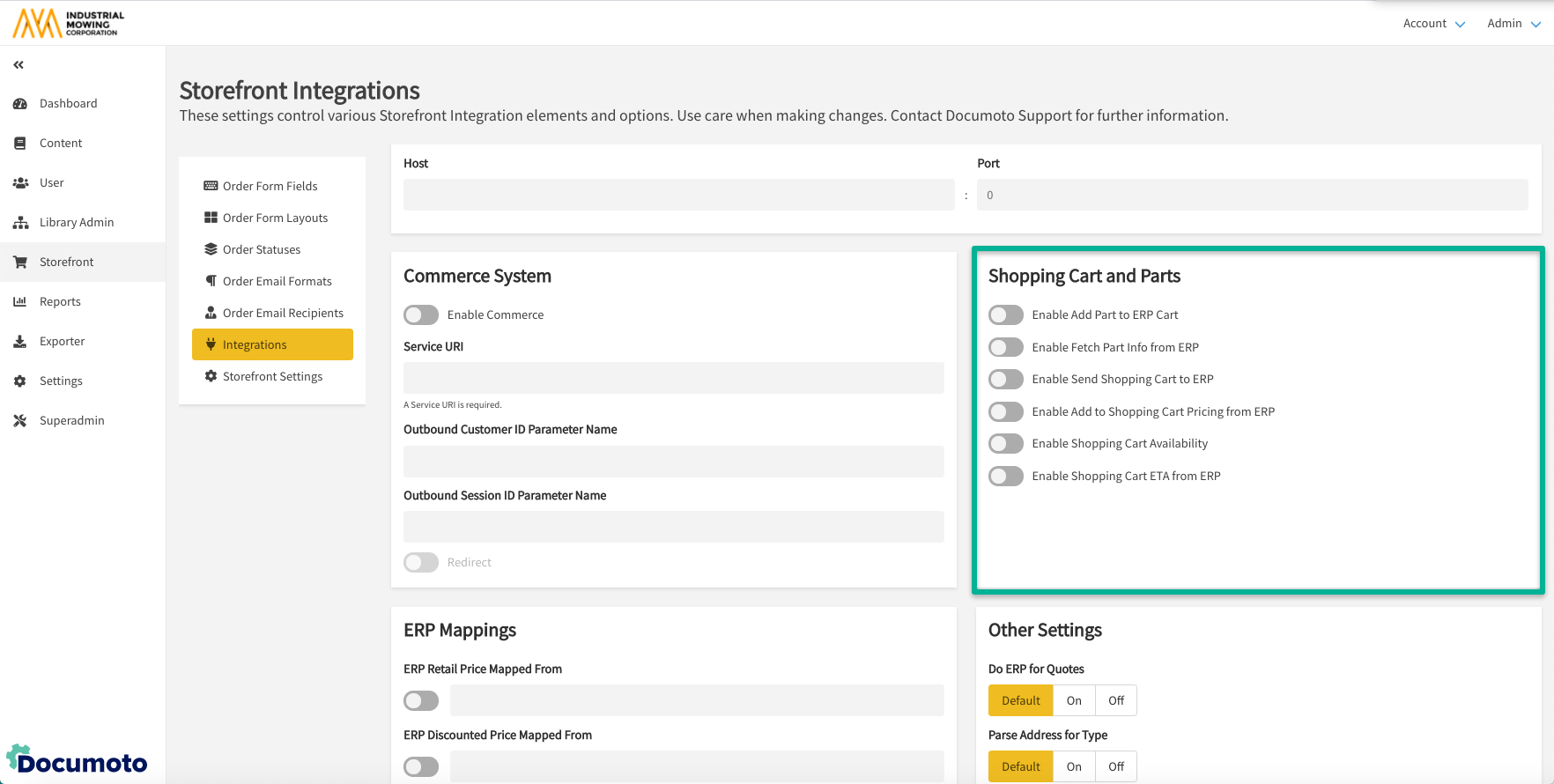 Shopping cart and part settings allow you to enable integration services for part information and shopping cart types of requests to your ERP, eCommerce, and EAM systems for your tenant. Once again, any changes to Shopping Cart and Parts settings could potentially break your Documoto integration. As a result, we highly recommend reaching out to your Documoto Customer Success Manager or Solutions Engineer prior to making any changes to these settings.