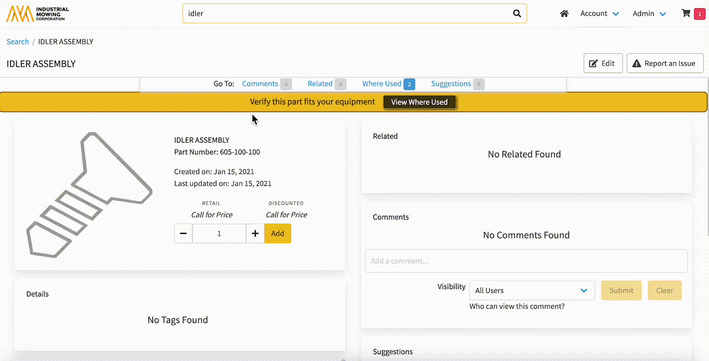 This article explains how to configure the Equipment Verification Banner, which appears on the Part Item Details page when users navigate directly to a Part.