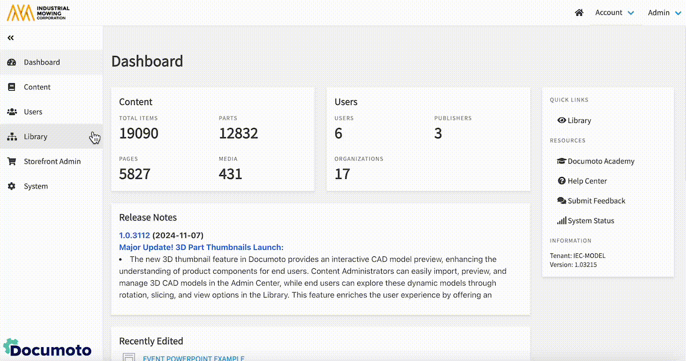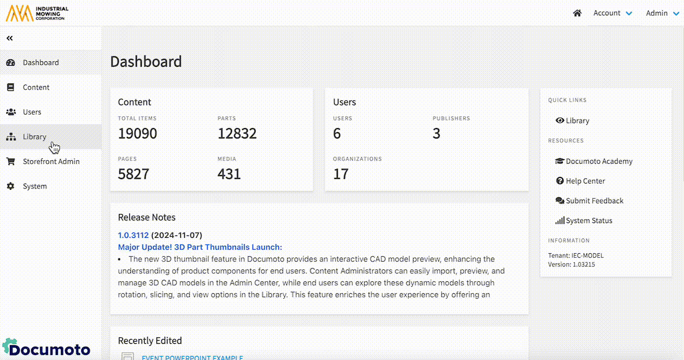 - Within the Documoto Admin Center, go to Library > Library Settings > Parts Display.