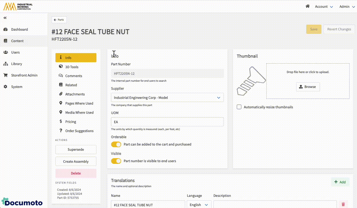 Documoto allows Content Administrators to enrich Parts by uploading visually appealing and interactive 3D CAD models. This article explains how to create a 3D Part Thumbnail in the Documoto Admin Center.