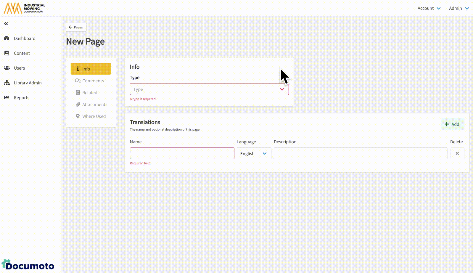 - Within Documoto Admin go to Content > Pages.