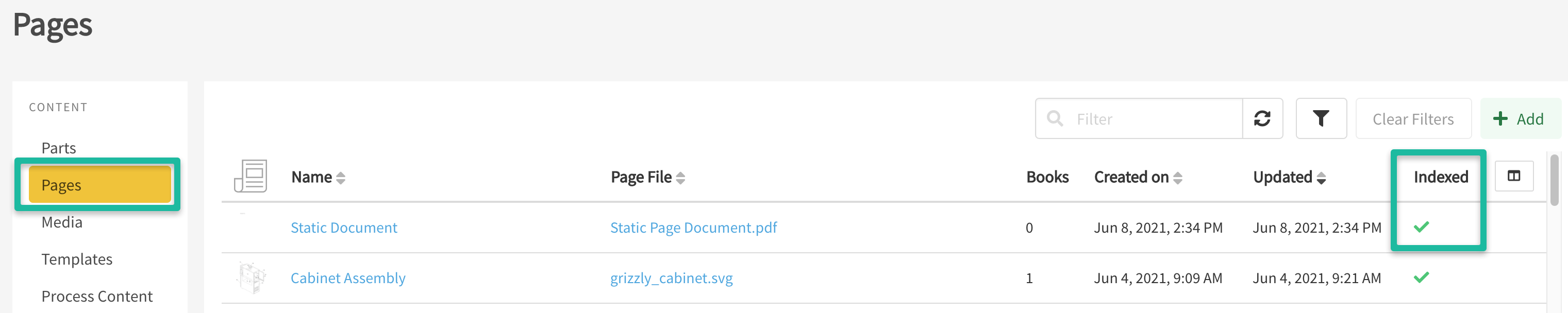 Before adding a static page to a chapter in a book, make sure to check that the Static Page has indexed. To confirm, you'll see a green checkmark in the Indexed column of the Page Editor.