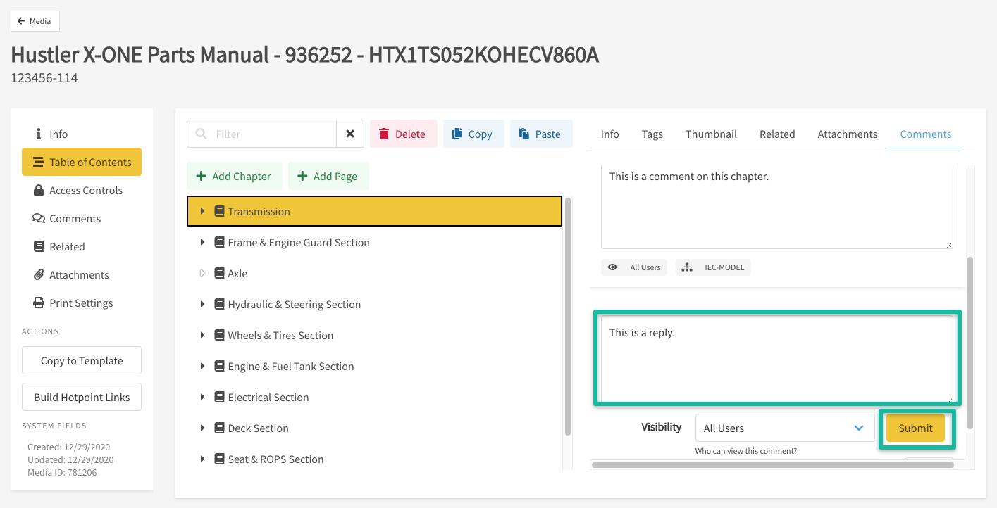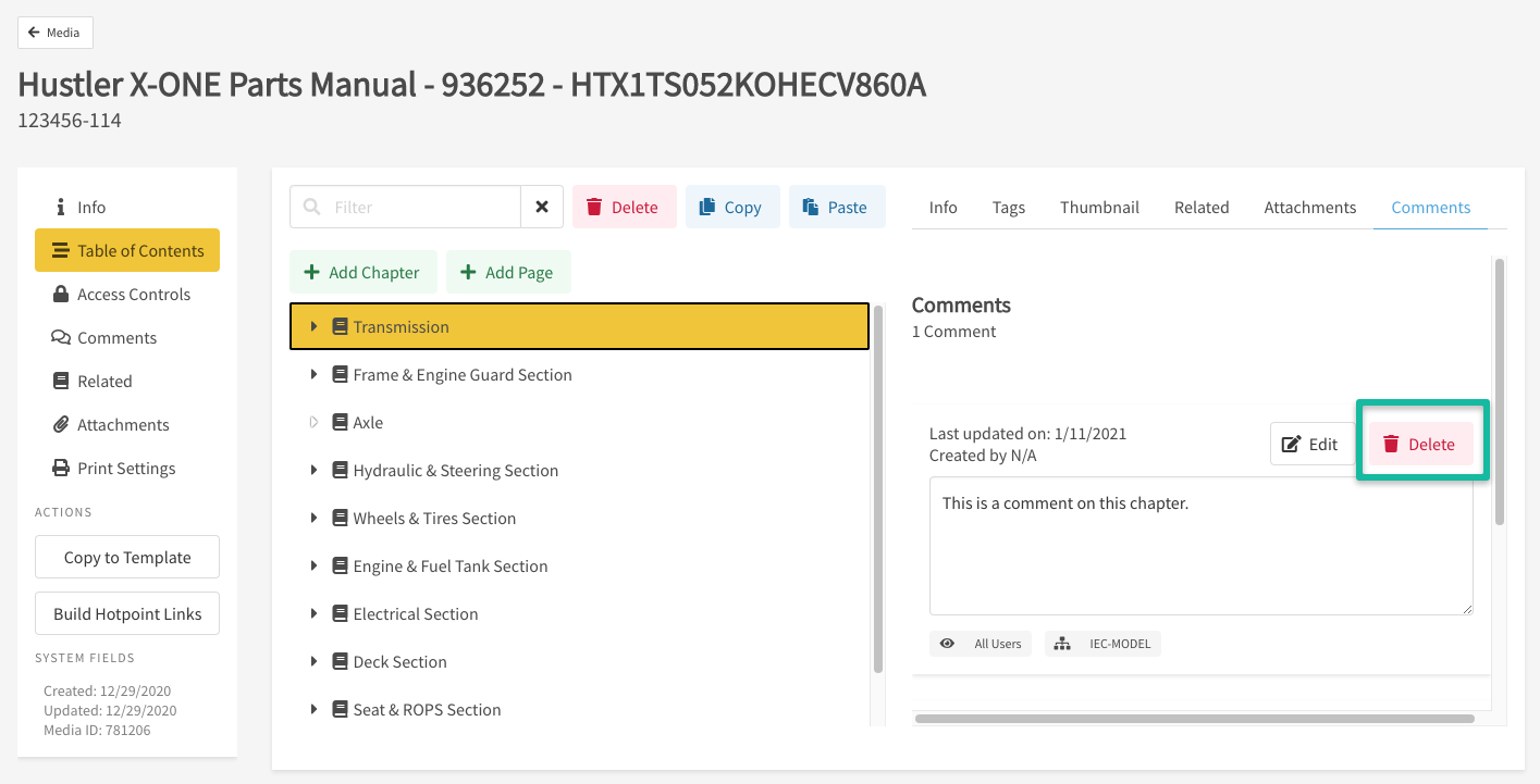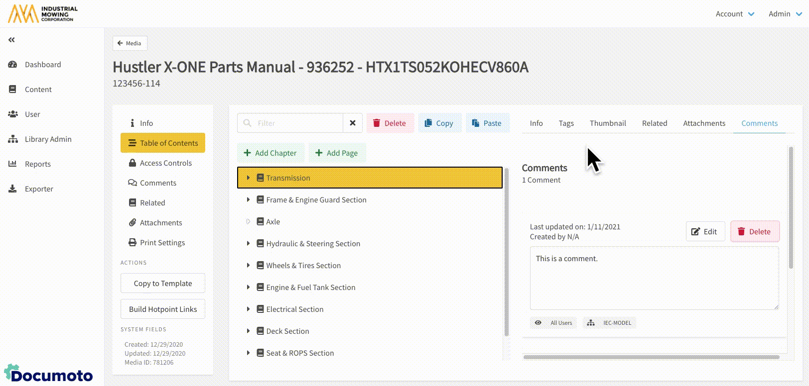 This article describes how Documoto users can create and manage comments on chapters within an interactive parts book.