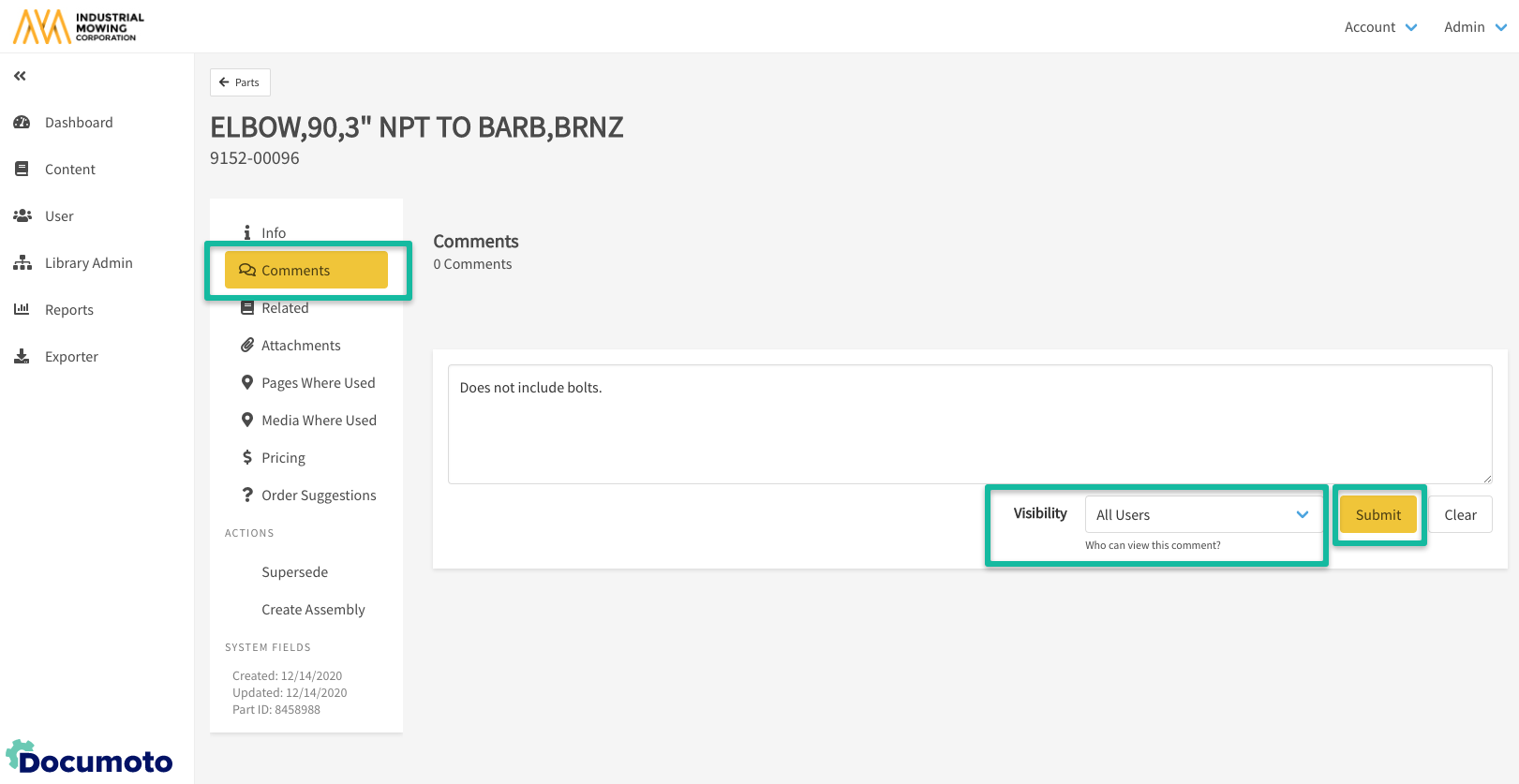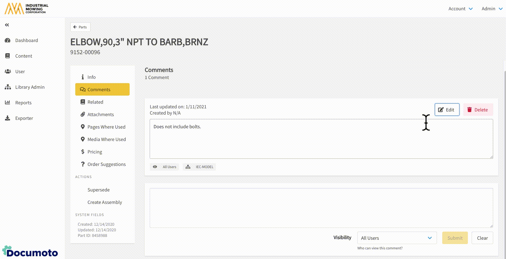 This article describes how Documoto users can create, edit, reply to and delete comments on parts.