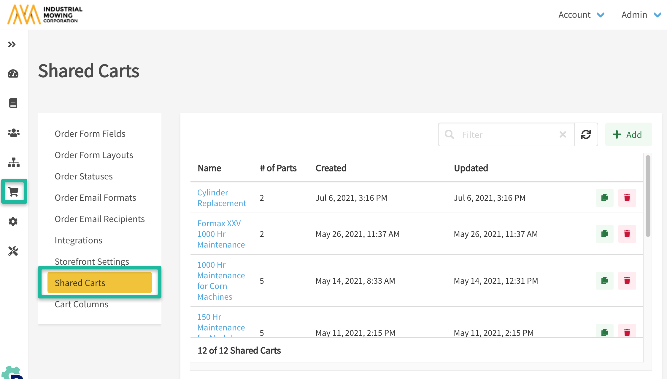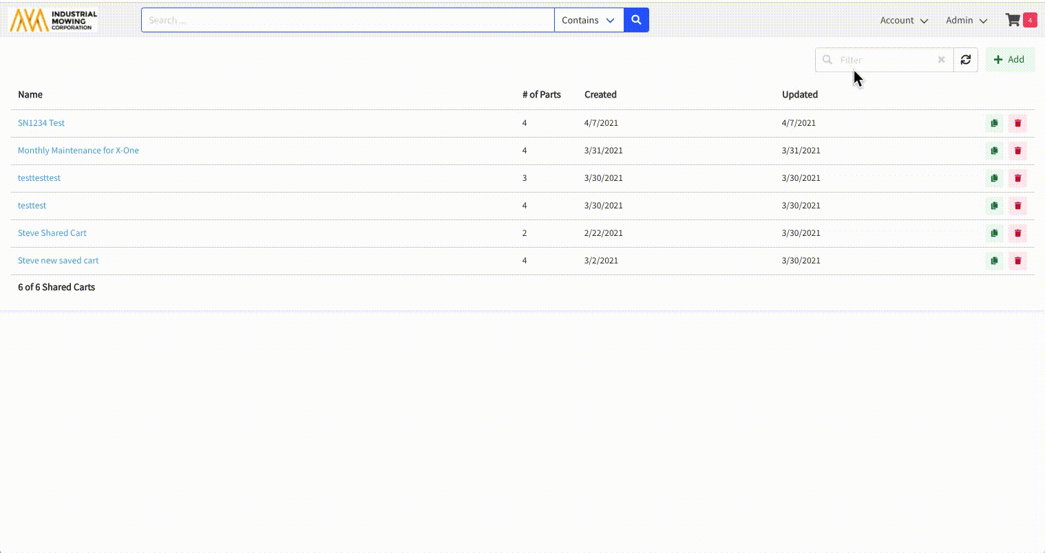Manage Shared Carts from Admin CenterThis article describes how to create, manage, and share shopping carts in Documoto. Shared Carts allow users to create and distribute a saved cart to organizations within your tenant. They are commonly used to share lists of parts that should be ordered for scheduled or regular equipment maintenance.