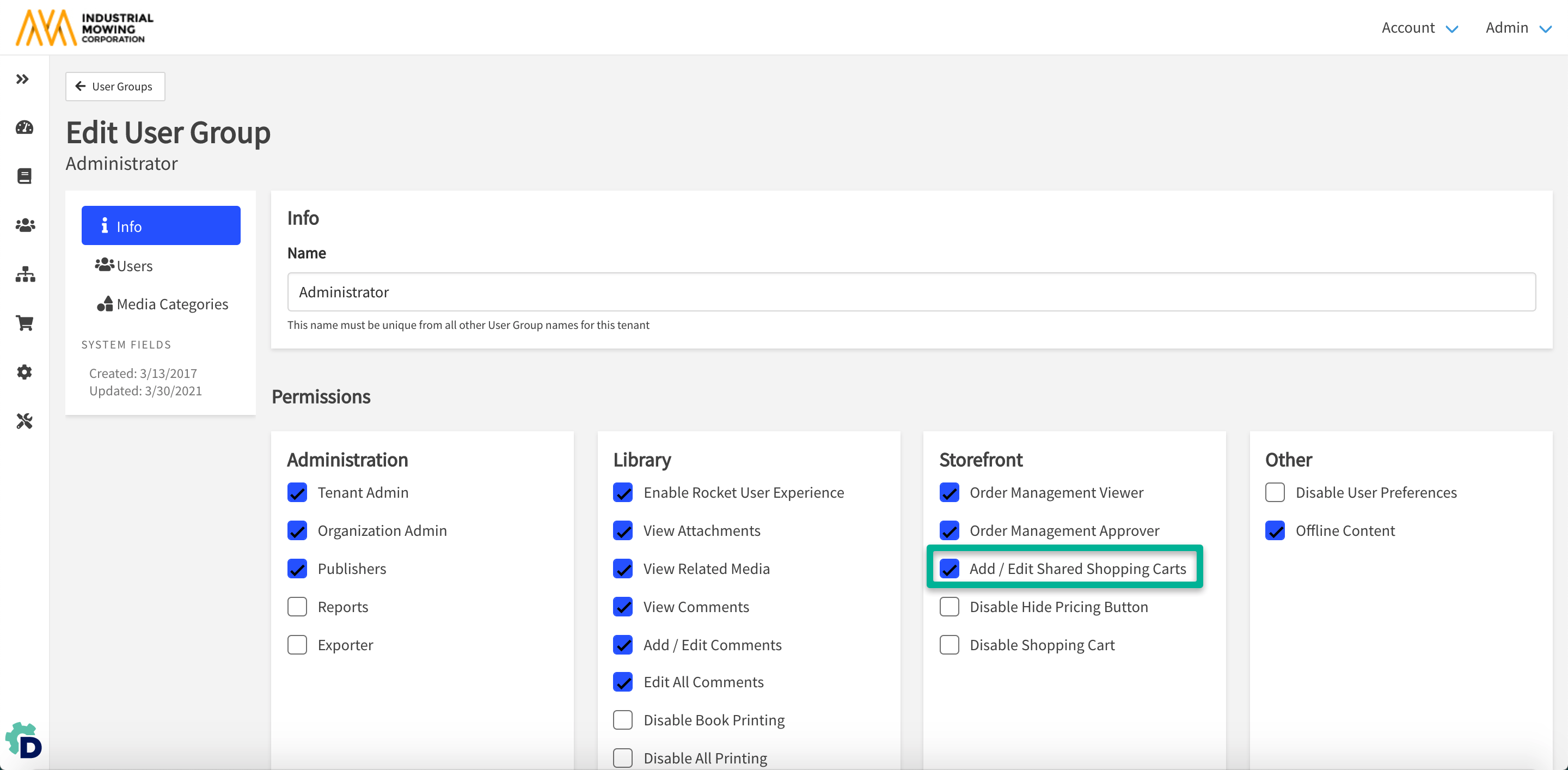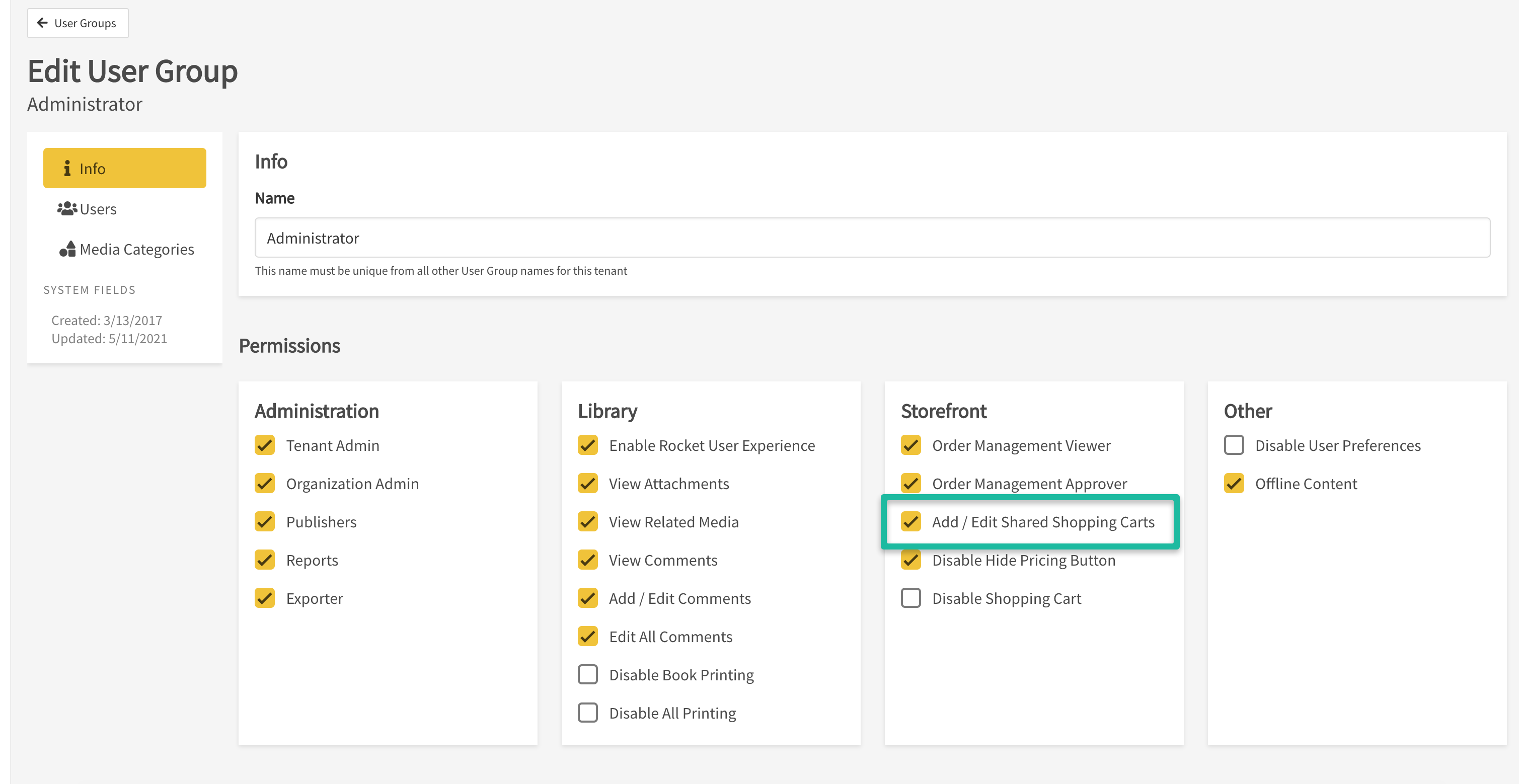 - Within Info > Permissions > Storefront, enable the Add / Edit Shared Shopping Carts privilege.
