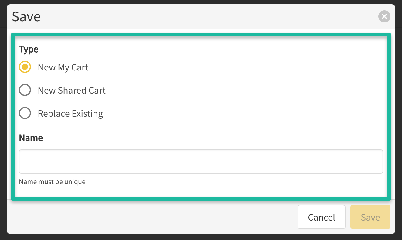 - Replace Existing: Replace an existing Shared or Saved Cart you select from the drop down list.