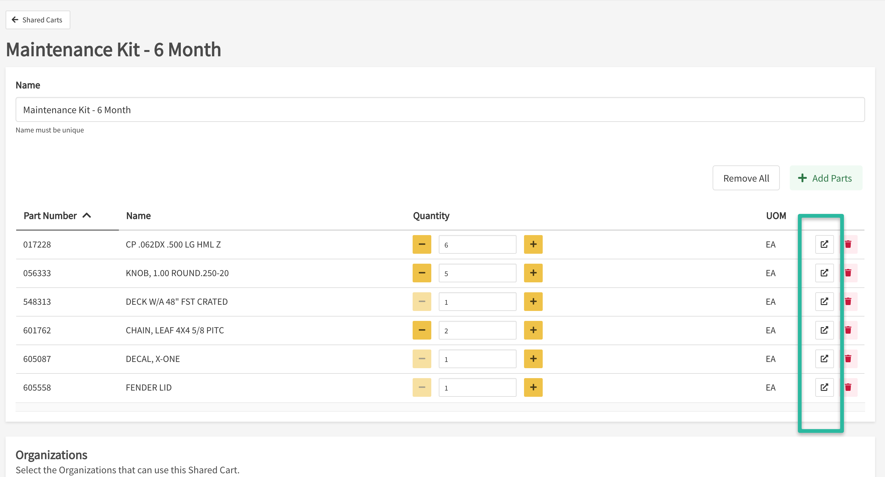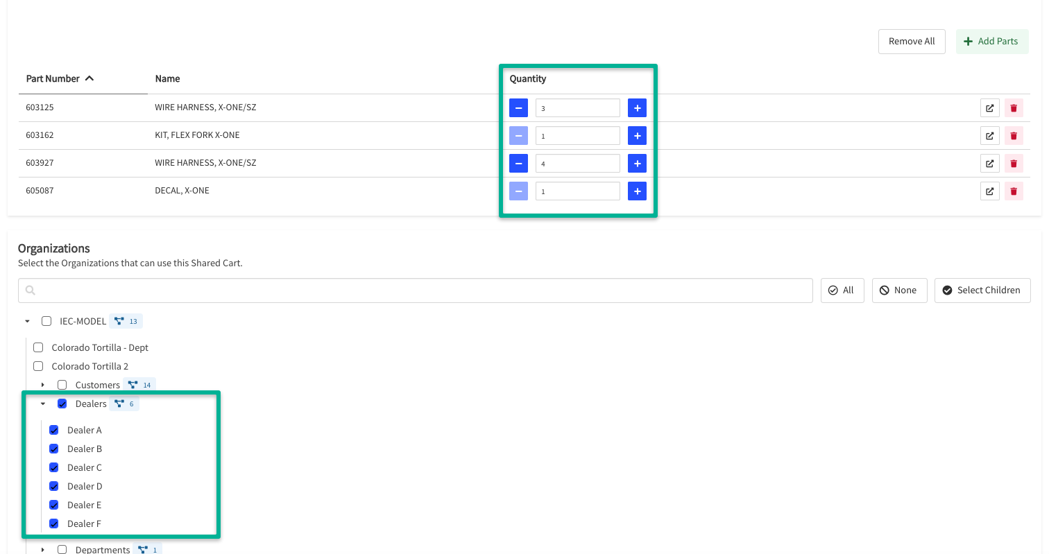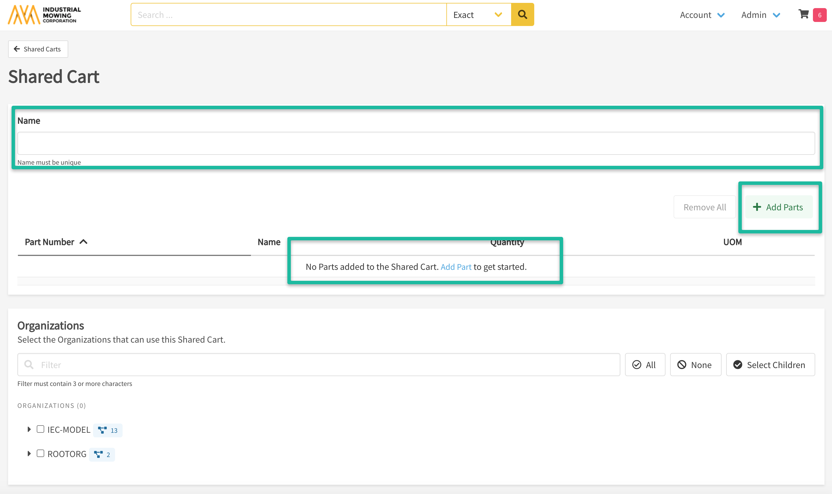 - New Shared Cart: The parts in your existing shopping cart will be saved as a Shared Cart where you can then select the Organizations that should also see it.
