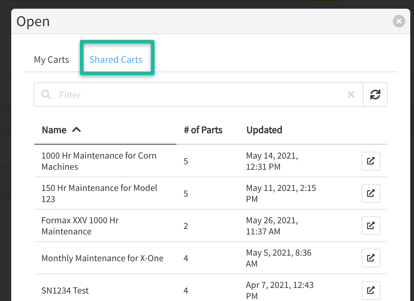 - Users within the organization(s) you gave access to should now be able to open the saved cart from Cart > Open.