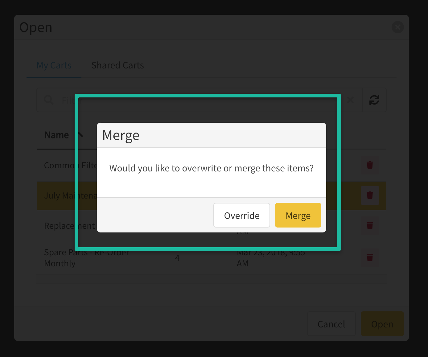 Tip: Parts from a Shared Cart can be merged into existing