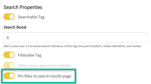 Any custom filter can be pinned to always display in search results. Pinned filters are ideal for commonly used tags or to highlight important content attributes.