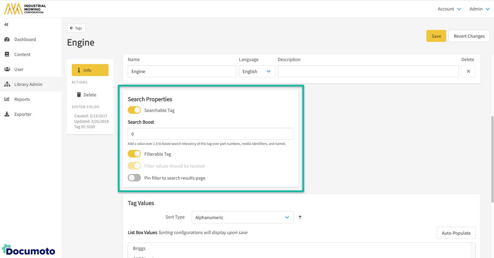 - Within Documoto Admin, go to Library Admin > Tags.