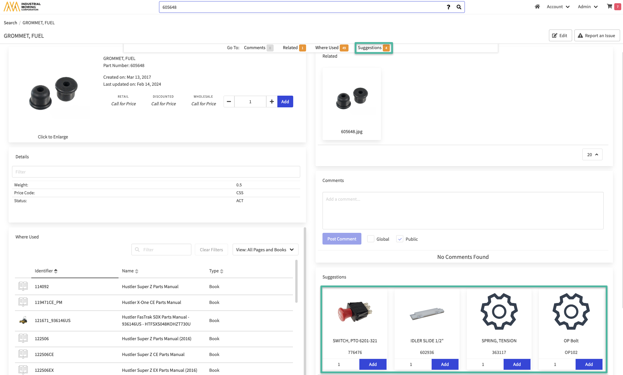Once setup, users will see the suggestions in the Parts Details Page under the Suggestions anchor on the related part, as well as in the Suggestions section of the Shopping Cart - as noted in the screenshots below.