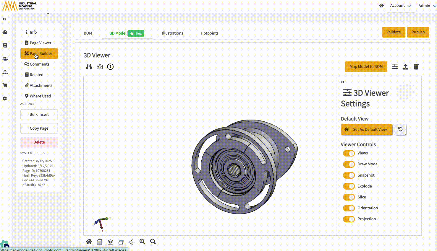 to open the 3D Viewer Settings. - To set a custom view for the Page's 3D Model, toggle on or off the applicable Viewer Controls