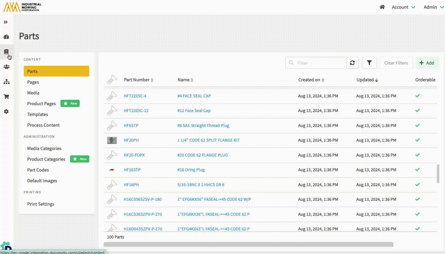 - Within Documoto Admin Center, go to Content > Parts