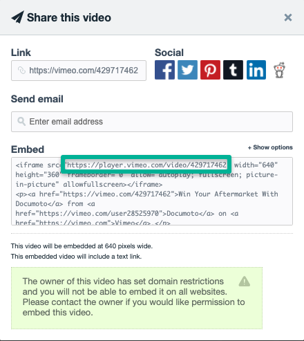 To find the embed URL for Vimeo videos, follow the instructions below: