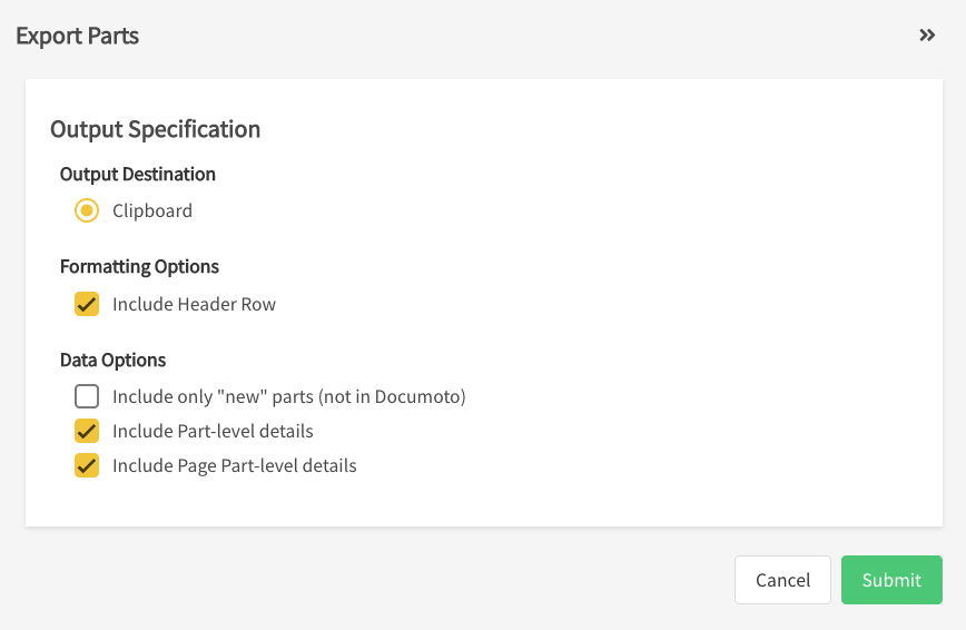 - Include only "new" parts (not in Documoto) - only Parts that have not previously been loaded into Documoto will appear in the Exported Parts List.