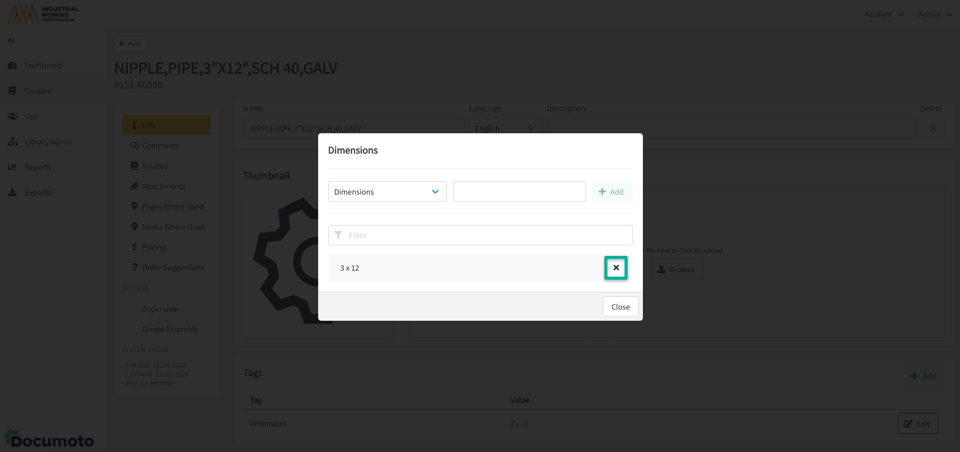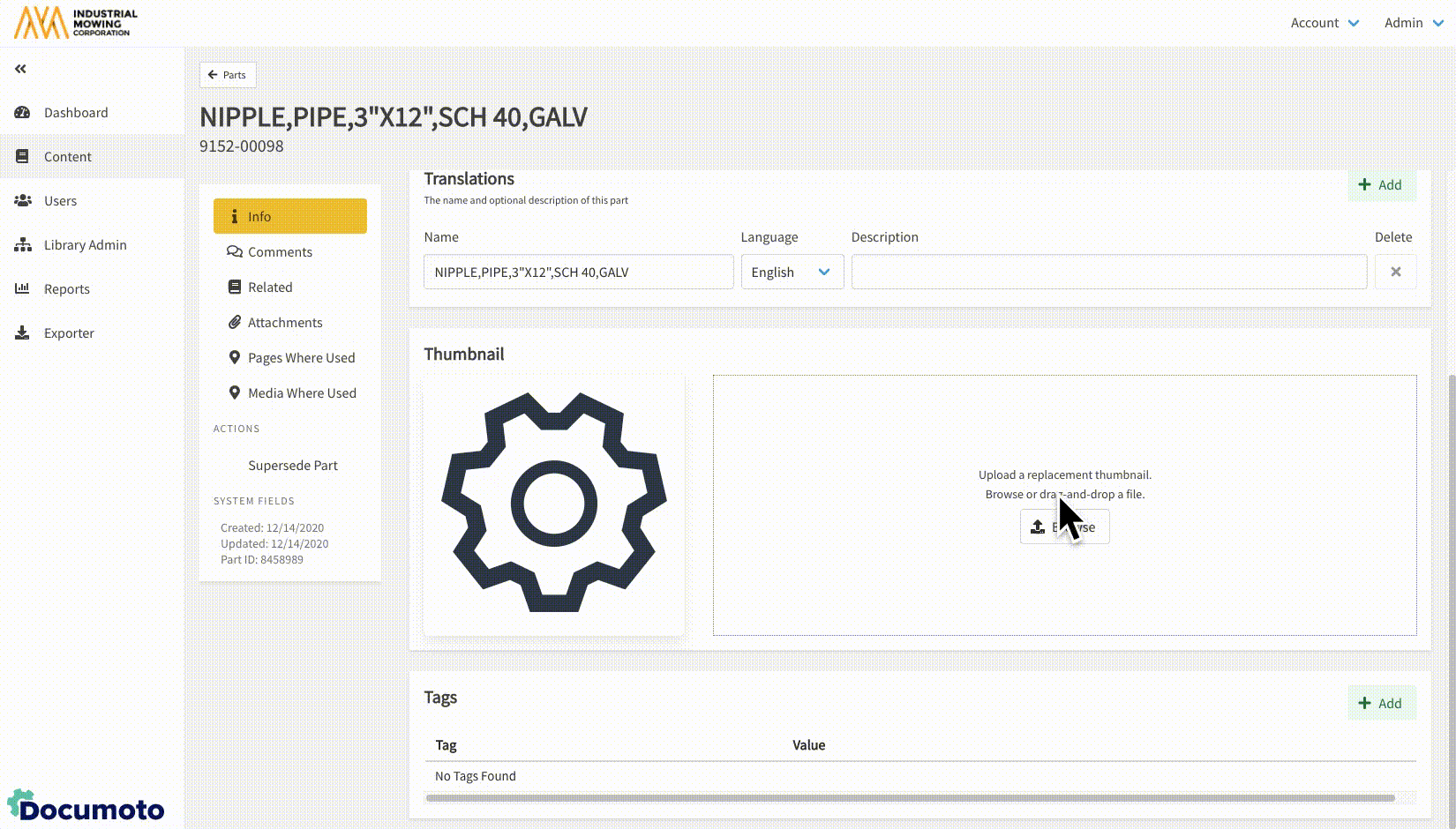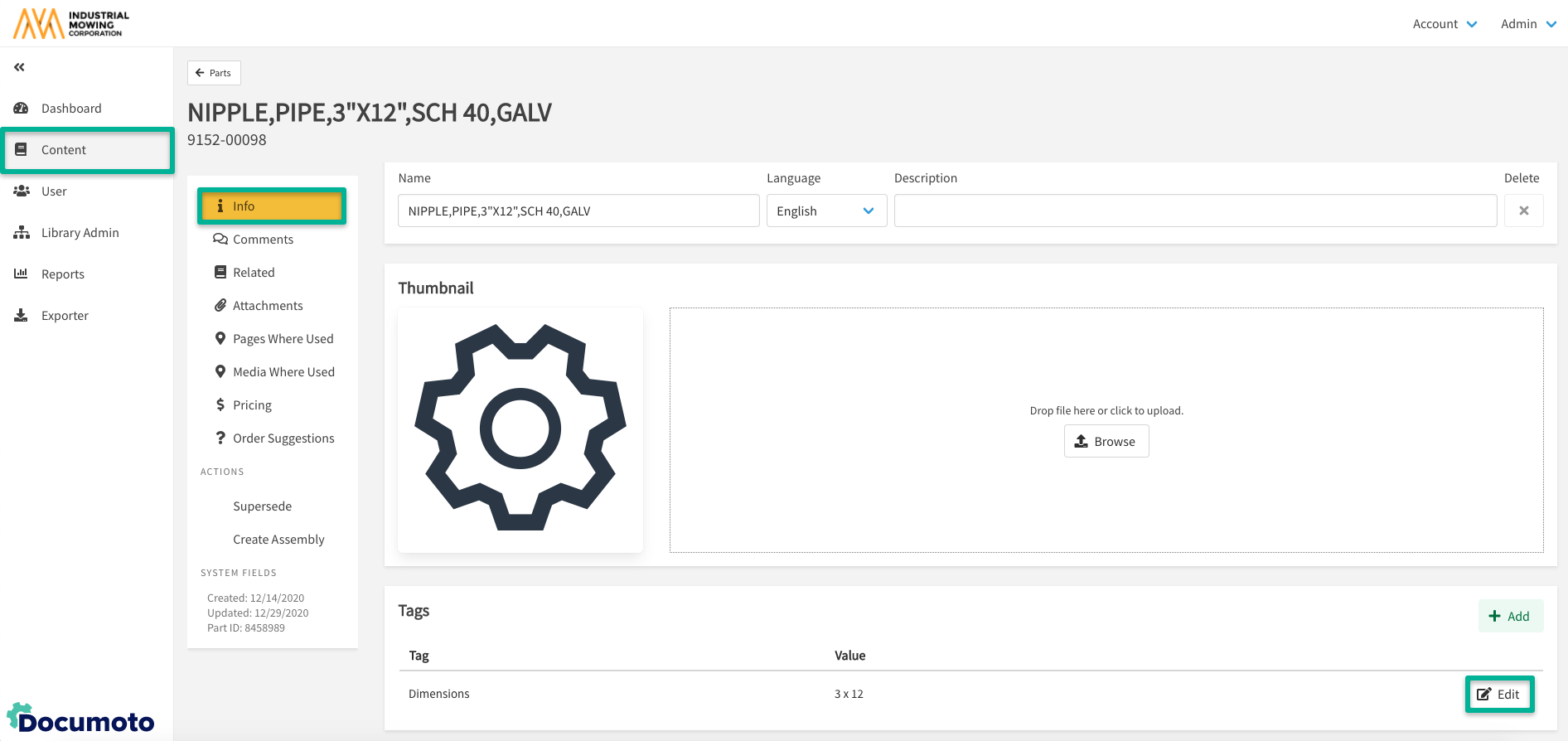 - Within Documoto, go to Admin Center > Content > Parts > select a part > Info.
