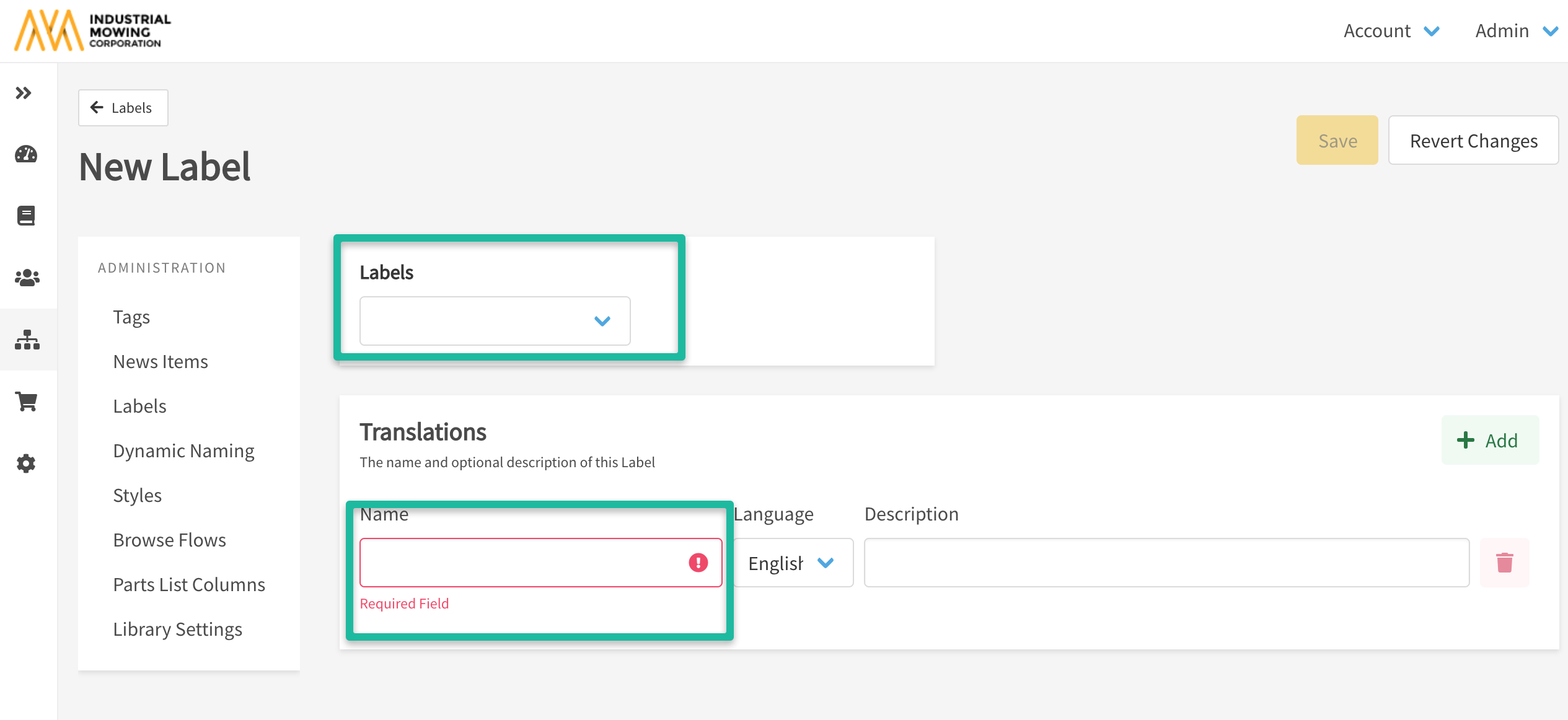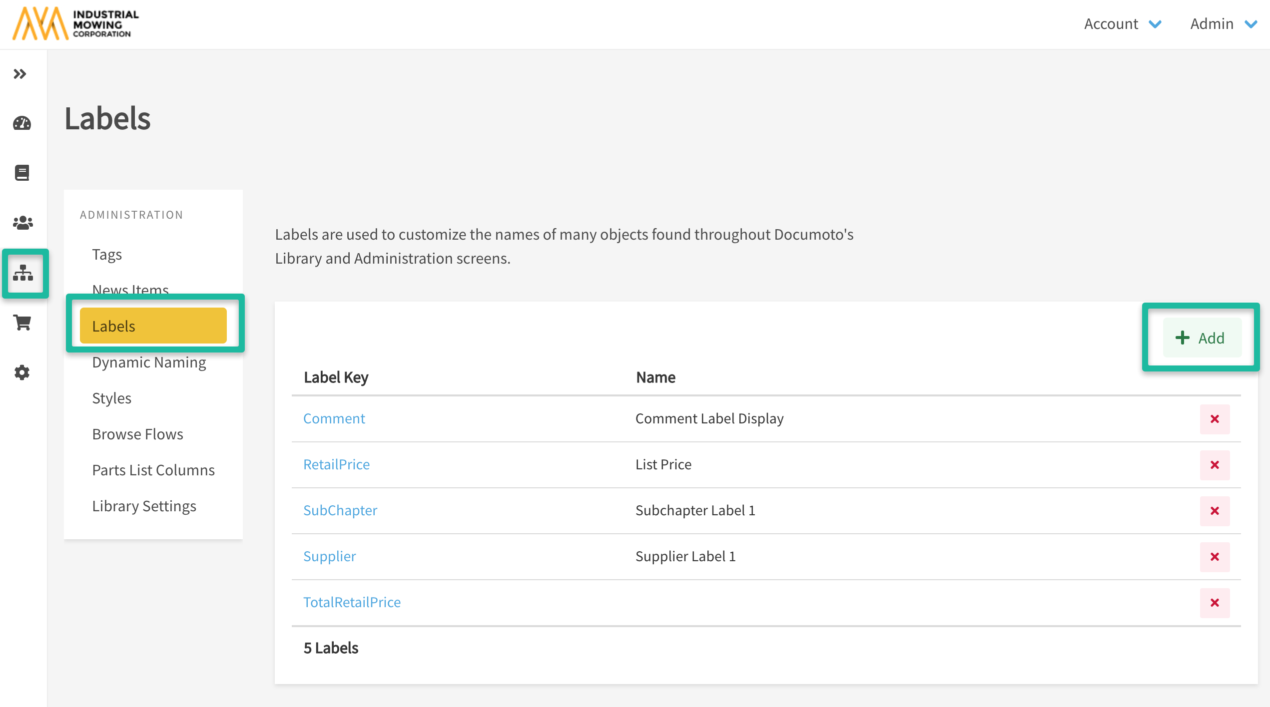 Administrators can customize Documoto’s interface by modifying system labels. Labels allow you to replace standard naming conventions (e.g., “Books” → “Machines”) so that the platform aligns with your company or industry terminology.