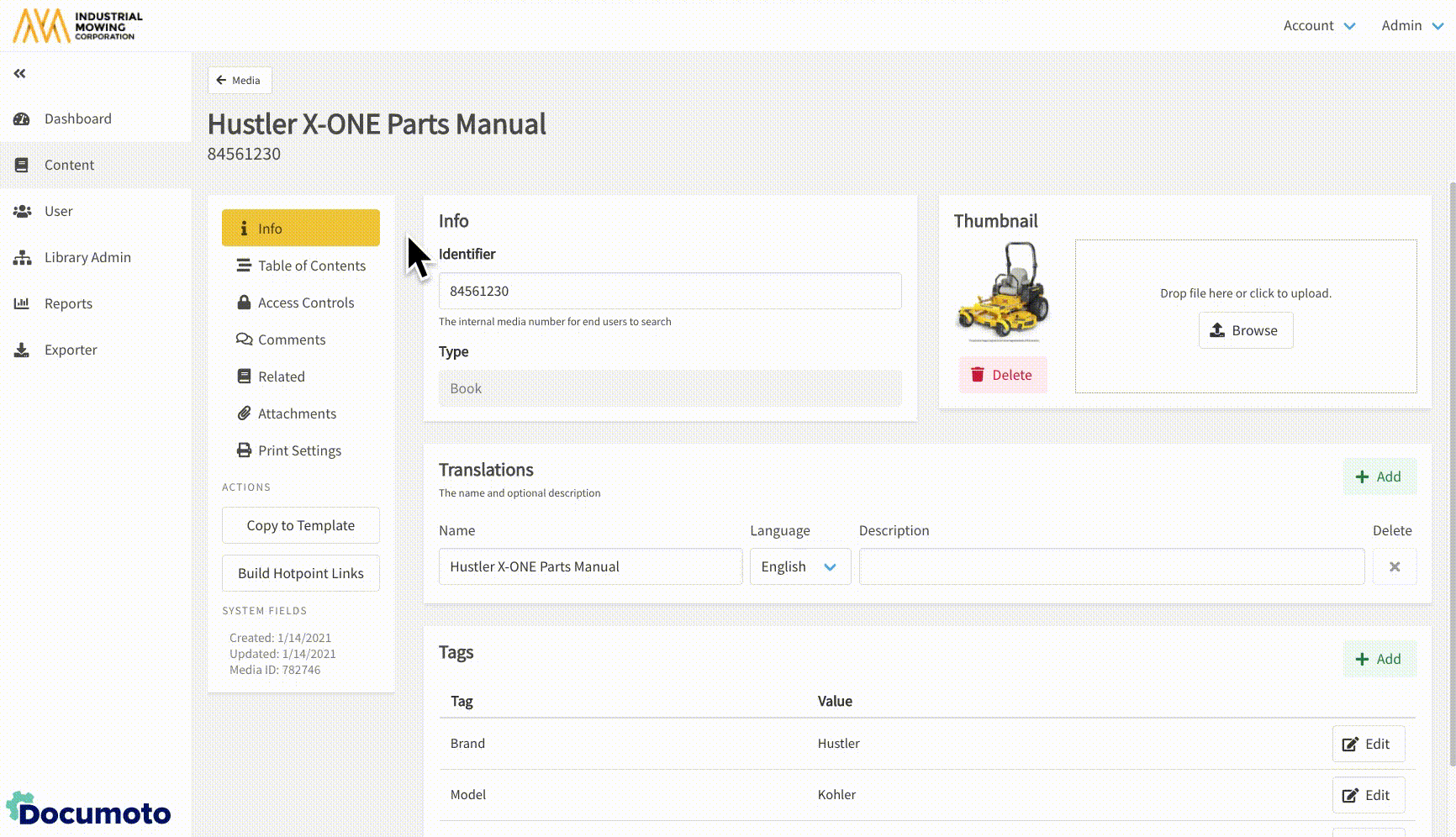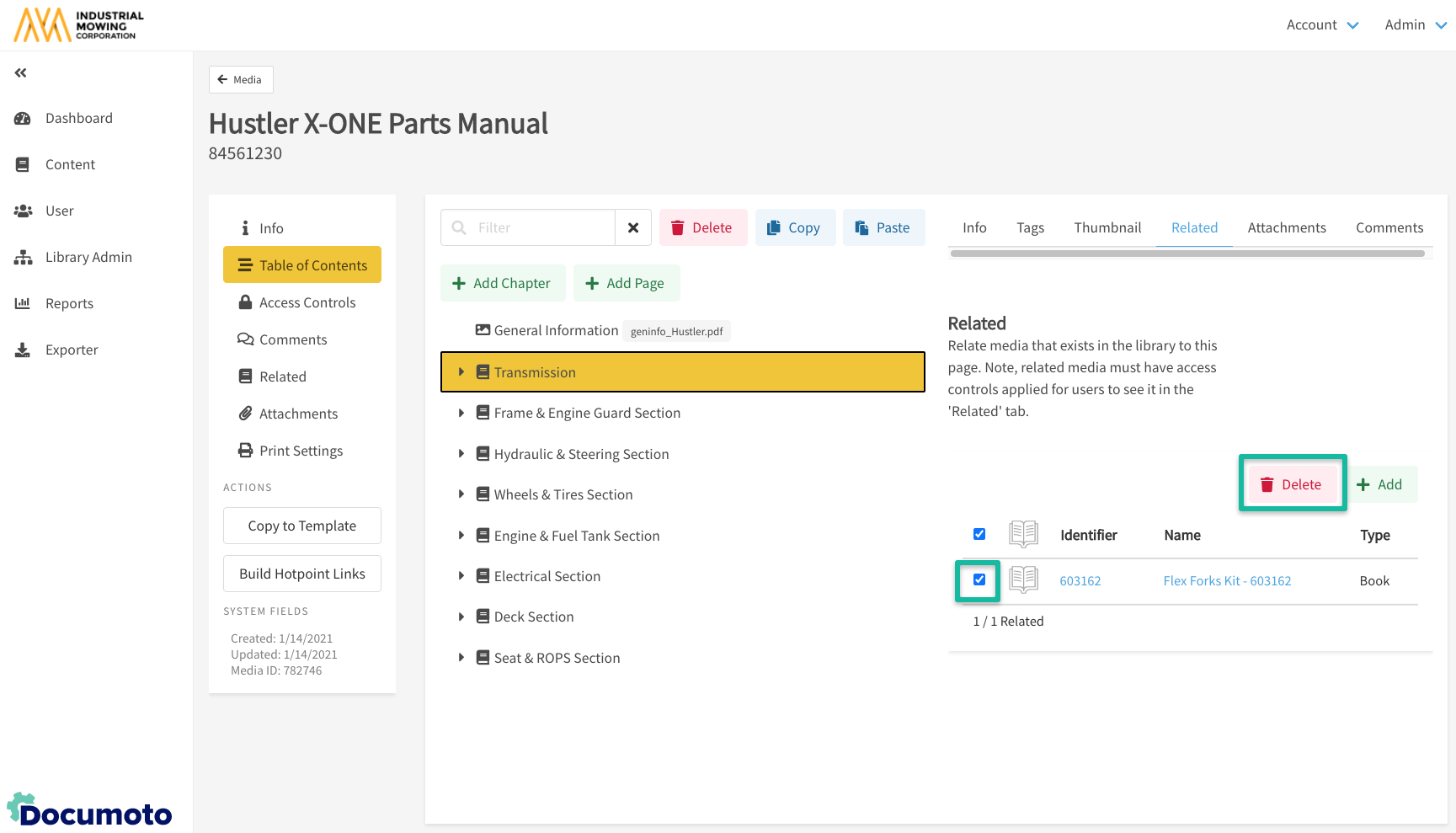 This article describes how to relate existing Documoto media to existing chapters within a book's table of contents. In the Documoto Library, related media can be found by selecting More Info in the Chapter Info viewer that takes you to the Chapter Details page.