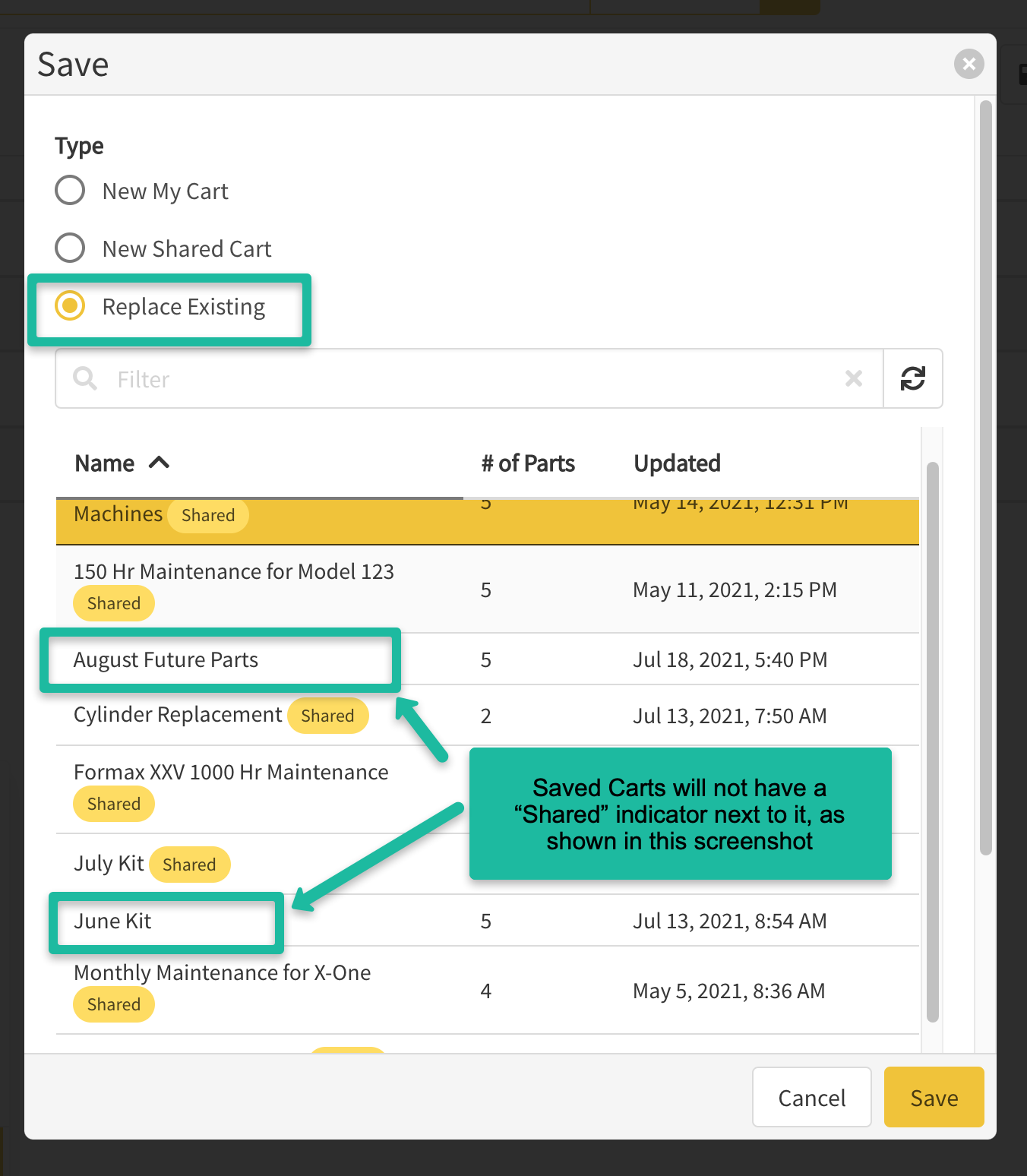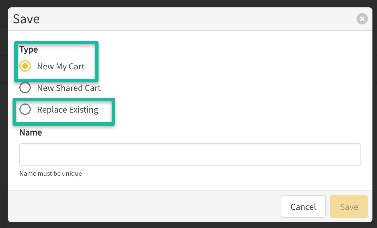 If replacing an existing Cart, you'll be presented with a drop down list of current Save or Shared Carts you can choose to replace and then specify a name for it. Shared Carts will only display as an option if your user has a User Group privilege to Add / Edit Shared Carts.