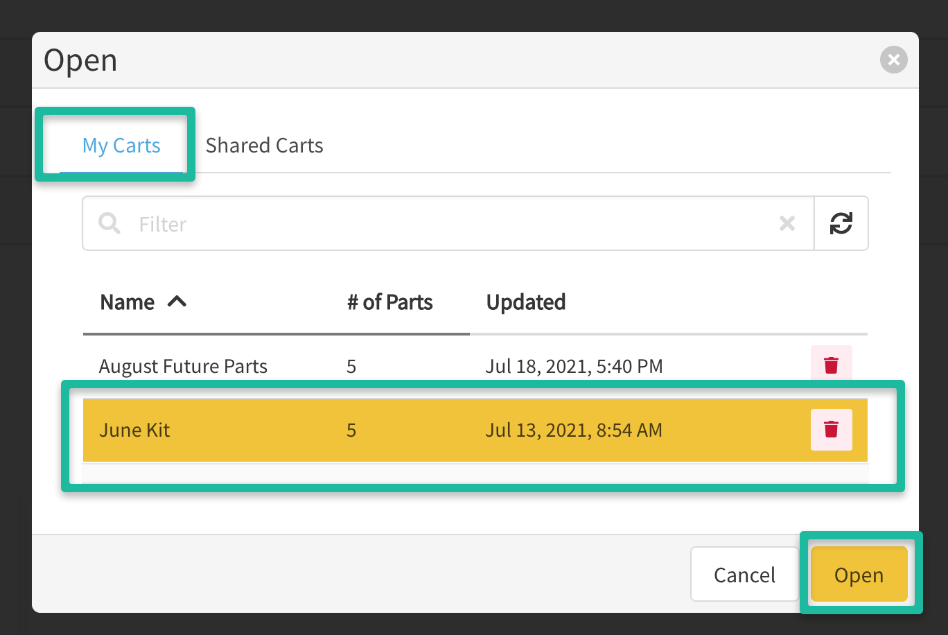 - Within the Documoto Library, click the Shopping Cart Icon and select Open.