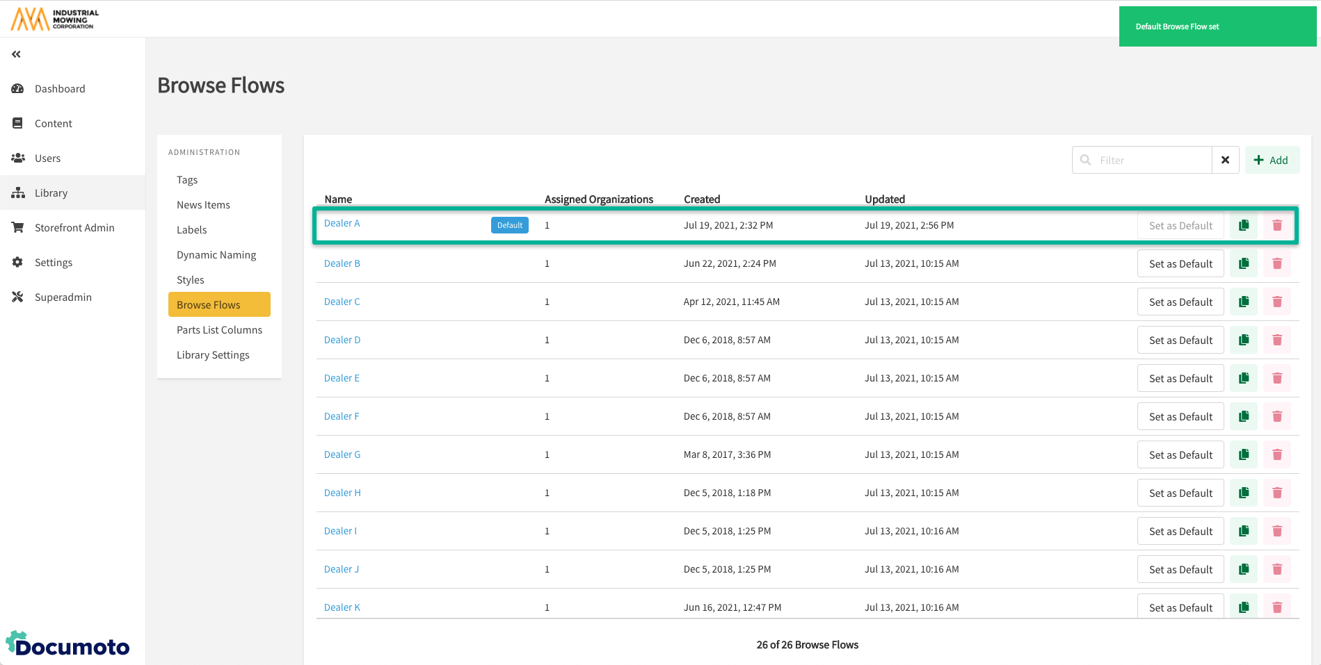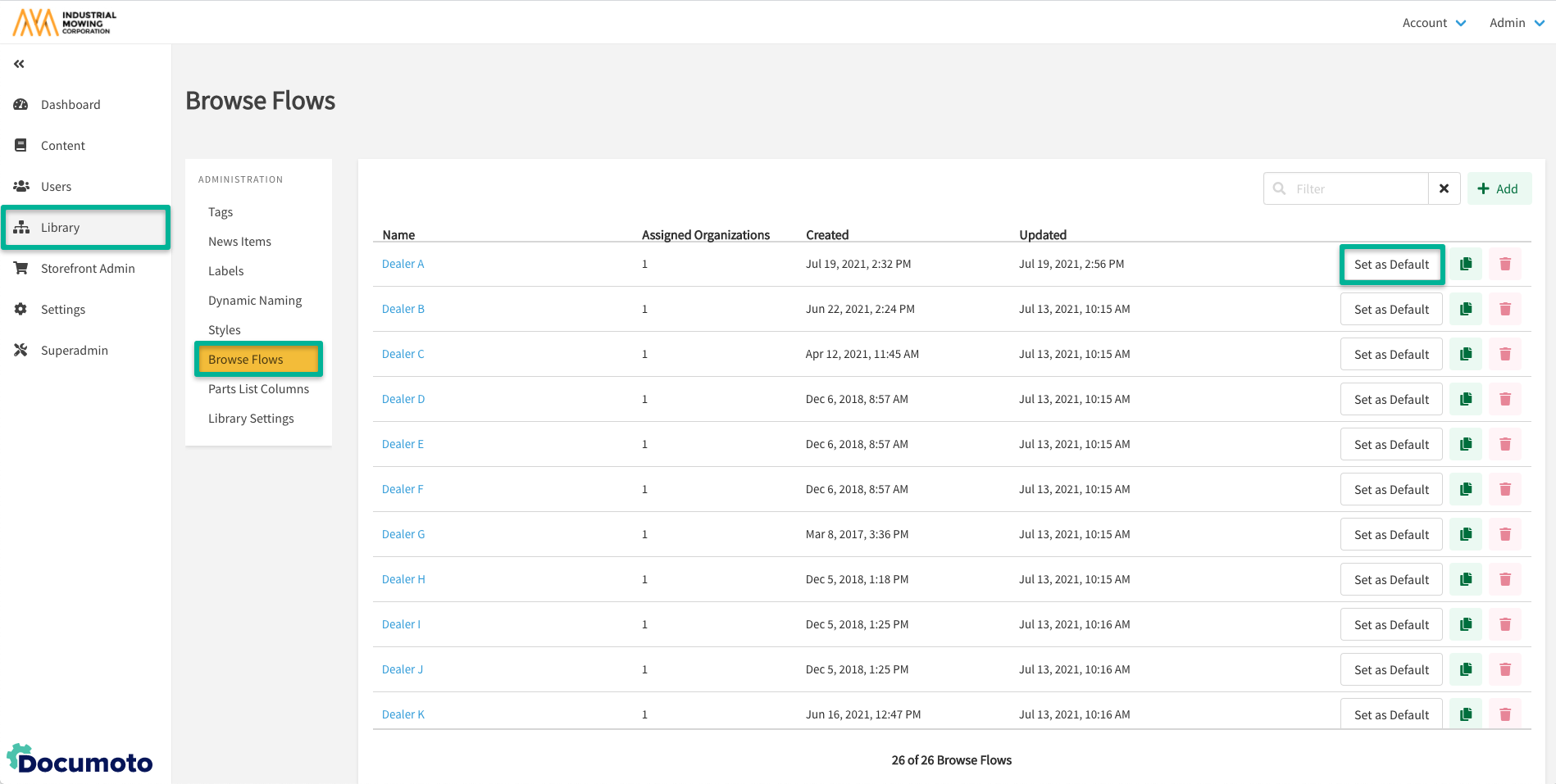 - Within Documoto Admin Center, go to Library Admin > Browse Flows.