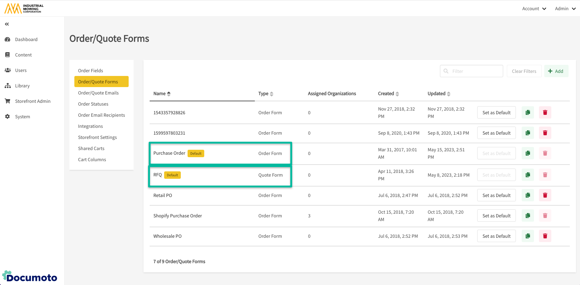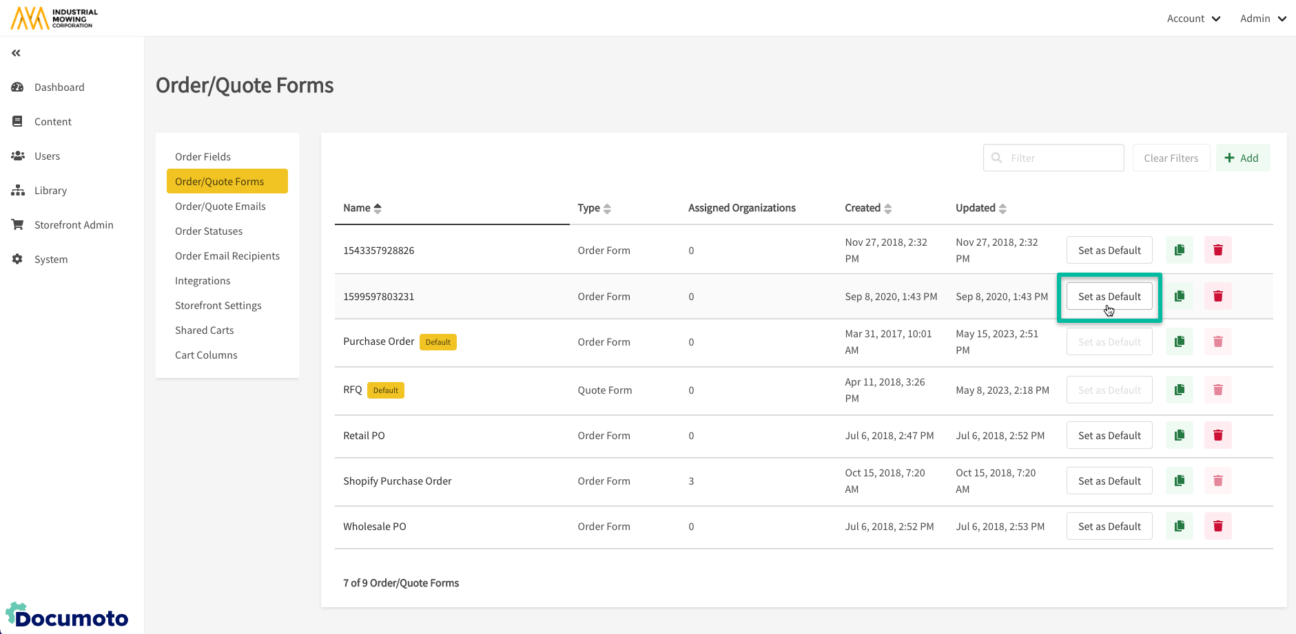 Documoto allows one default to be set for each type of form - one (1) default Order Form and one (1) default Quote Form.